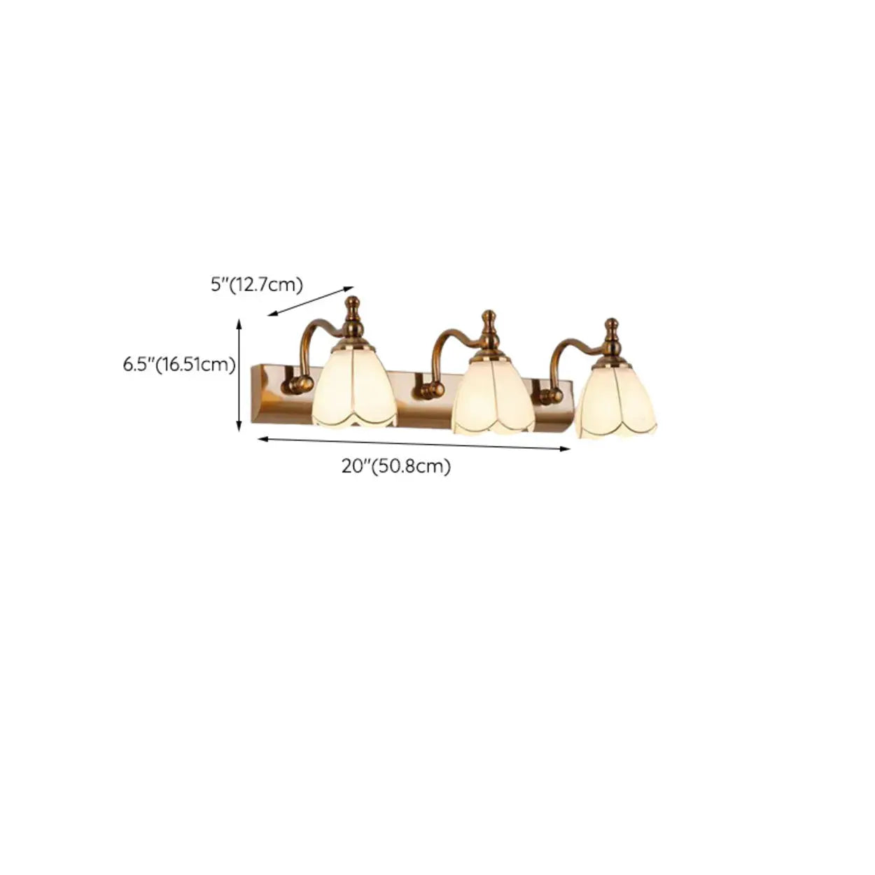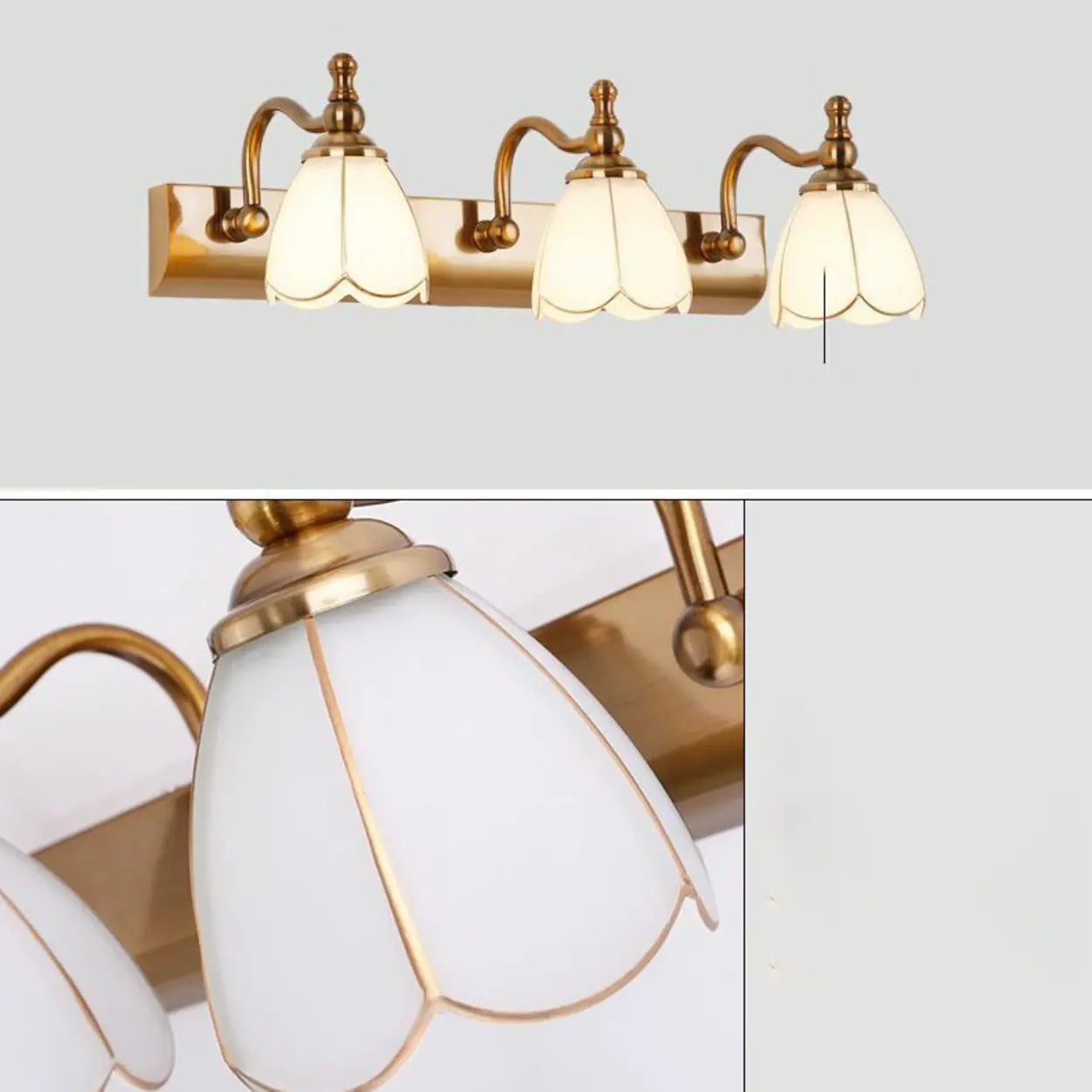 This elegant vintage brass vanity lamp combines traditional design with modern functionality, adding classic charm to your room. The graceful curved arm and petal-shaped lampshade allow the light to flow softly, creating a warm atmosphere. It is especially suitable for installation in front of the bathroom mirror to provide ample lighting for your morning and evening washing.