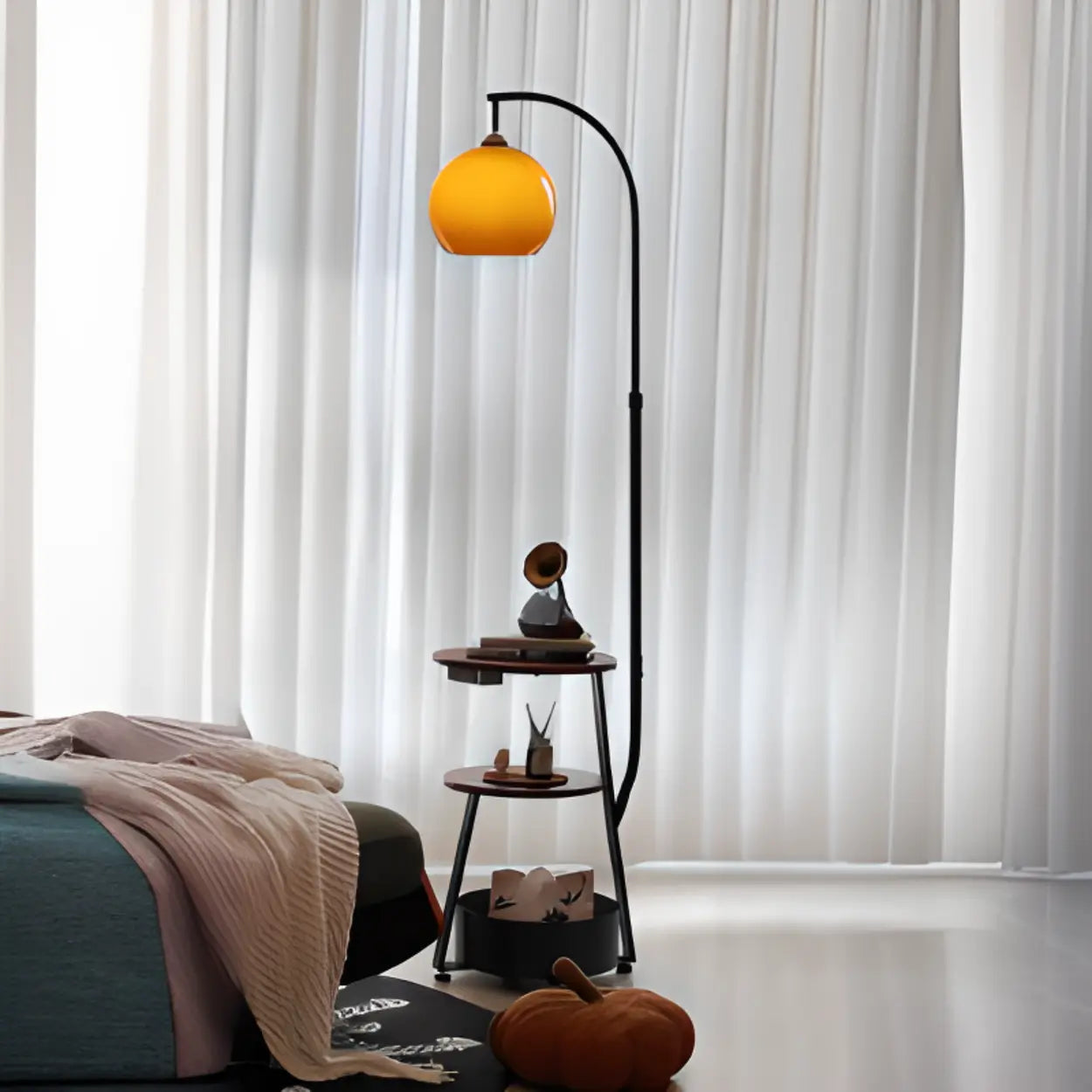 This arc floor lamp combines lighting with practical storage in one stylish piece. The orange glass dome casts warm ambient light, while three integrated shelves provide convenient space for plants, books, or décor. The sleek black frame and round base work well next to sofas or in bedrooms, creating an organized, multifunctional focal point.
