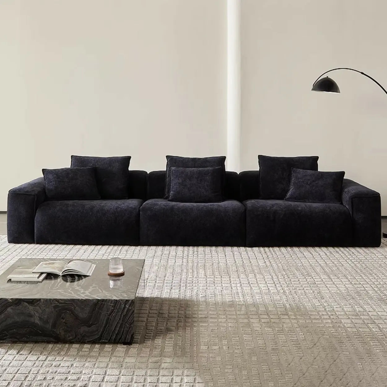 This modern sofa is made of high-quality chenille fabric, offering ultimate comfort and a stylish appearance. Its deep black tone complements any interior decoration and becomes the focal point of the space. The wide seat and backrest present perfect support, which is ideal for relaxing or hosting a family gathering with friends. It is easy to install and takes up little space, which is a perfect match for modern commercial and home environments.