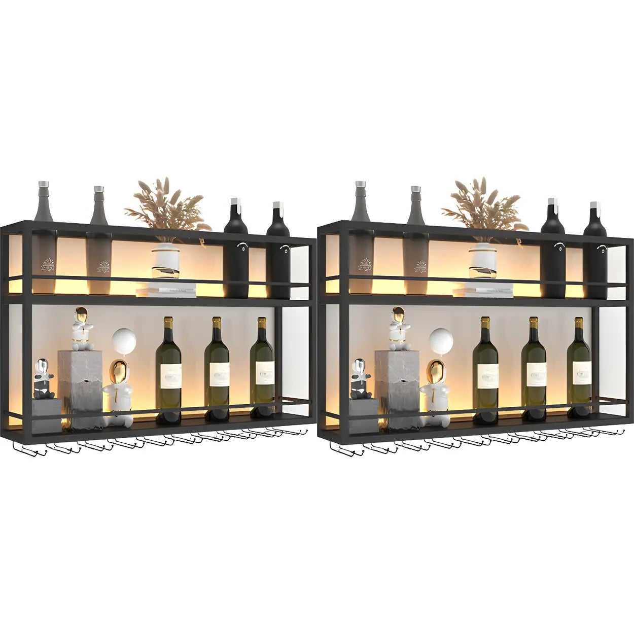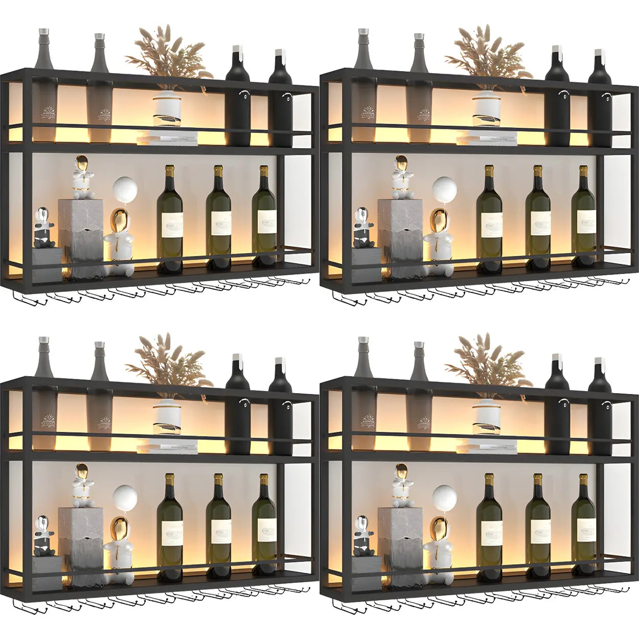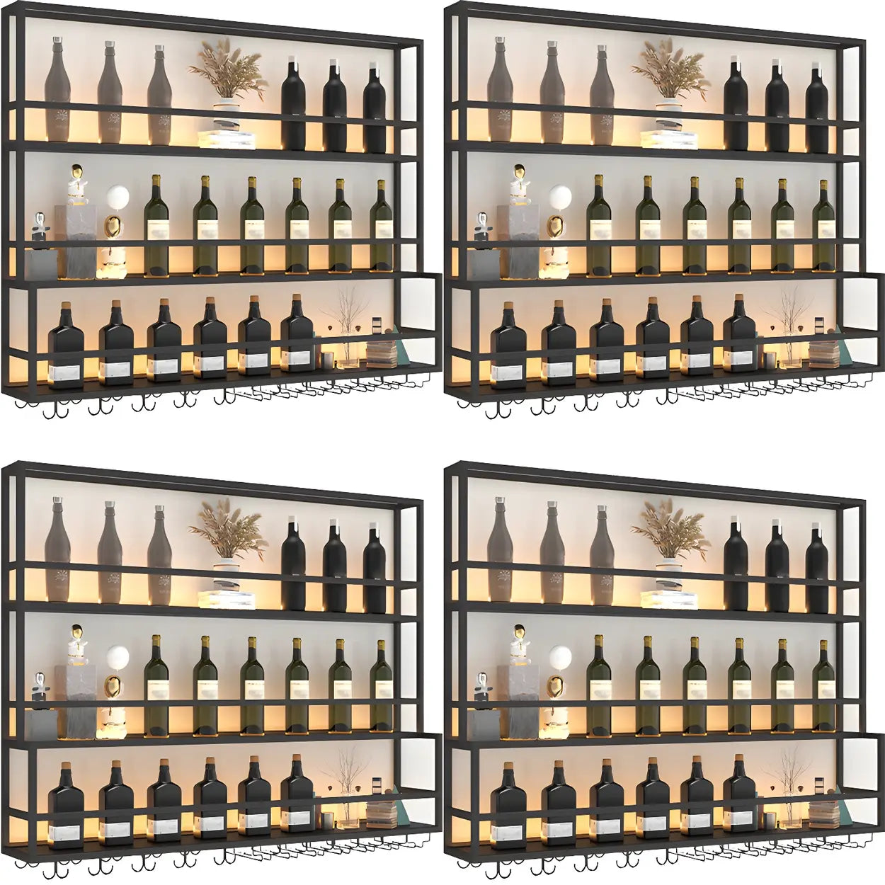 Black Metal Floating Stackable Wall Mounted Wine Rack - 39.4"L x 7.9"W x 25.6"H / With Light / 1 Piece is backordered and will ship as soon as it is back in stock.