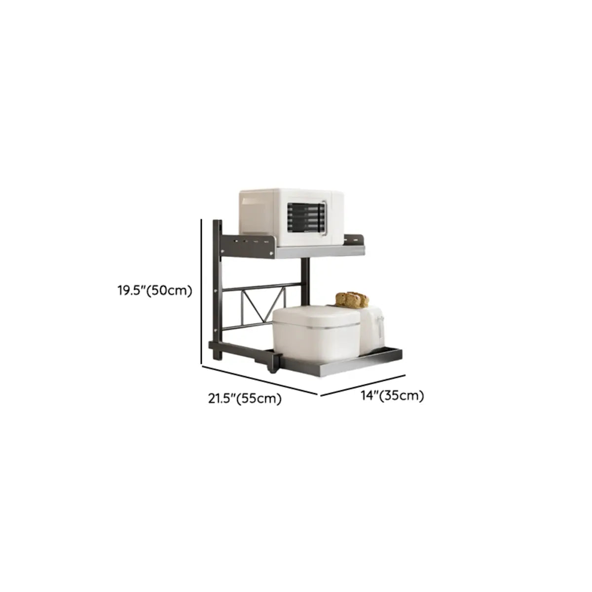 Working well in any kitchen to store things in an organized manner, this extremely functional and stylish black metal storage rack offers great convenience. Tailored for heavy-duty appliances such as microwaves and ovens, the well-built metal frame offers high stability, while the two-layer design showcases items in a well-organized manner.