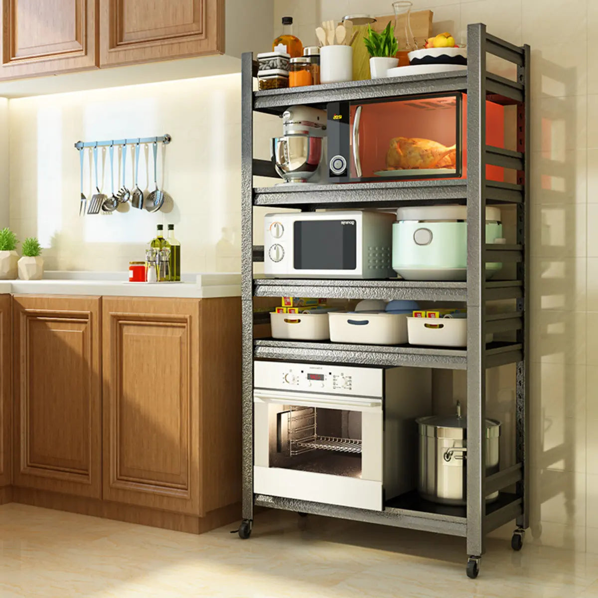 The multi-layer design furnishes a lot of storage space for appliances and supplies.