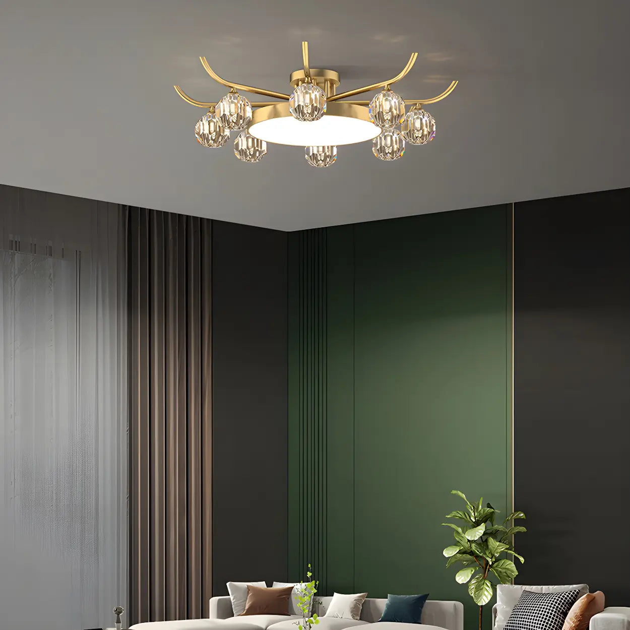 - This brass crystal ball ceiling lamp has a luxurious gold design that adds a noble and elegant atmosphere to indoor spaces.