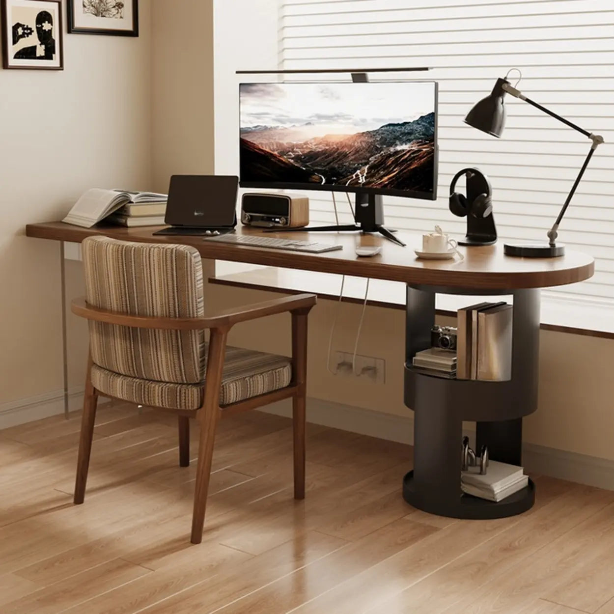 This stylish rectangular walnut table furnishes an abundant workspace for two people. Its unique round base repository layout not only enhances the stability of the table but also nourishes immense depository areas for books, documents, and daily necessities. The tabletop is formed of high-quality walnut wood, displaying a natural and gorgeous texture, and showing a refined temperament. Whether it is employed for office, study, or creation, this table can fulfill your demands.