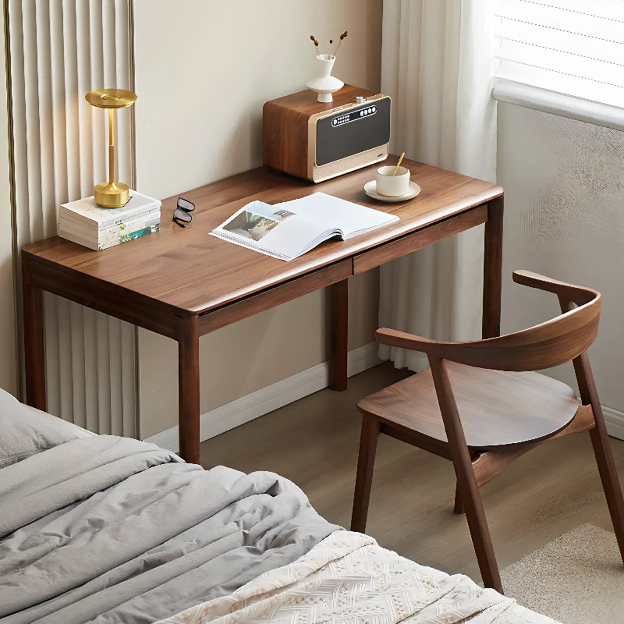 This Scandinavian-style rectangular walnut desk immaculately merges minimalist conception with expediency. Its refined appearance and meticulous craftsmanship confirm its quality. Composed of superior walnuts, the natural wood grain introduces a hint of warmth to your workspace. Available in diverse sizes, this desk is endowed with an abundant drawer repository, seamlessly furnishing a neat and orderly desktop while maximizing area utilization. Whether placed in a home study or an office, this desk invigorates your backdrop with freshness and efficiency.