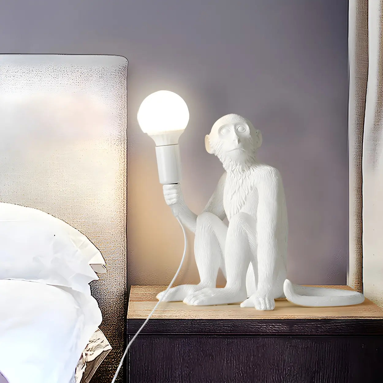 This monkey resin table lamp perfectly combines modern art with practicality and is a unique highlight of any home decoration. Its innovative exposed bulb design not only provides ample light, but also adds a personalized sense of humor, making it an ideal choice for living rooms, bedrooms, study rooms, and many other occasions.