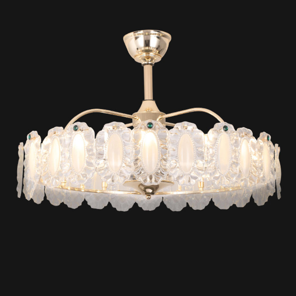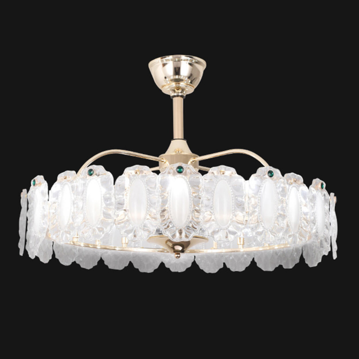 - This golden plastic 3-blade ceiling fan has built-in LED lights and can be used for both lighting and decoration.