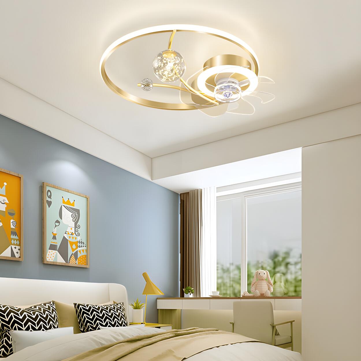 - This spherical decorative metal ring ceiling fan with light runs quietly, making it comfortable at night without noise disturbance.
