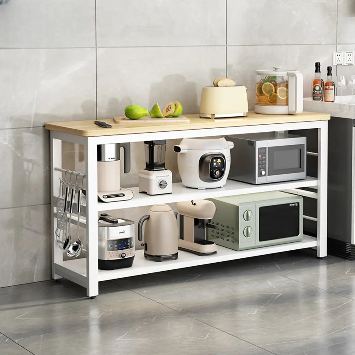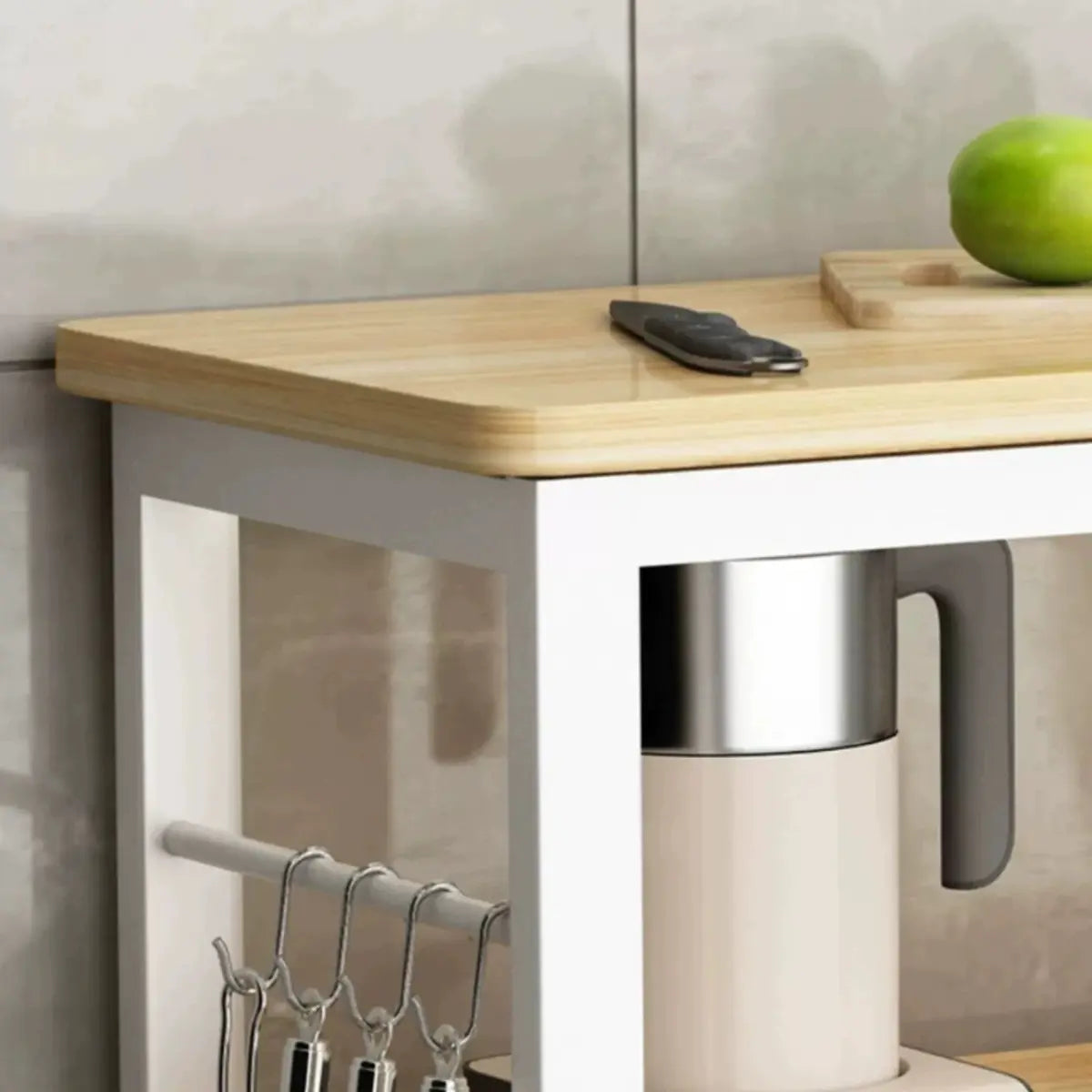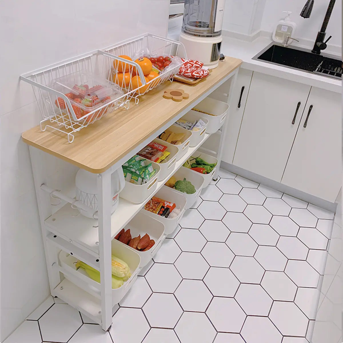This kitchen cart offers a simple and modern design. Its rectangular shape and wooden countertop heighten a touch of nature to your kitchen. The white frame brings a fresh visual effect. Many open storage shelves can store vegetables, fruits, condiments, and other kitchen supplies. Plus, it is suitable as a preparation table for auxiliary ingredients or a simple display rack for items, effectively improving the efficiency of kitchen use.