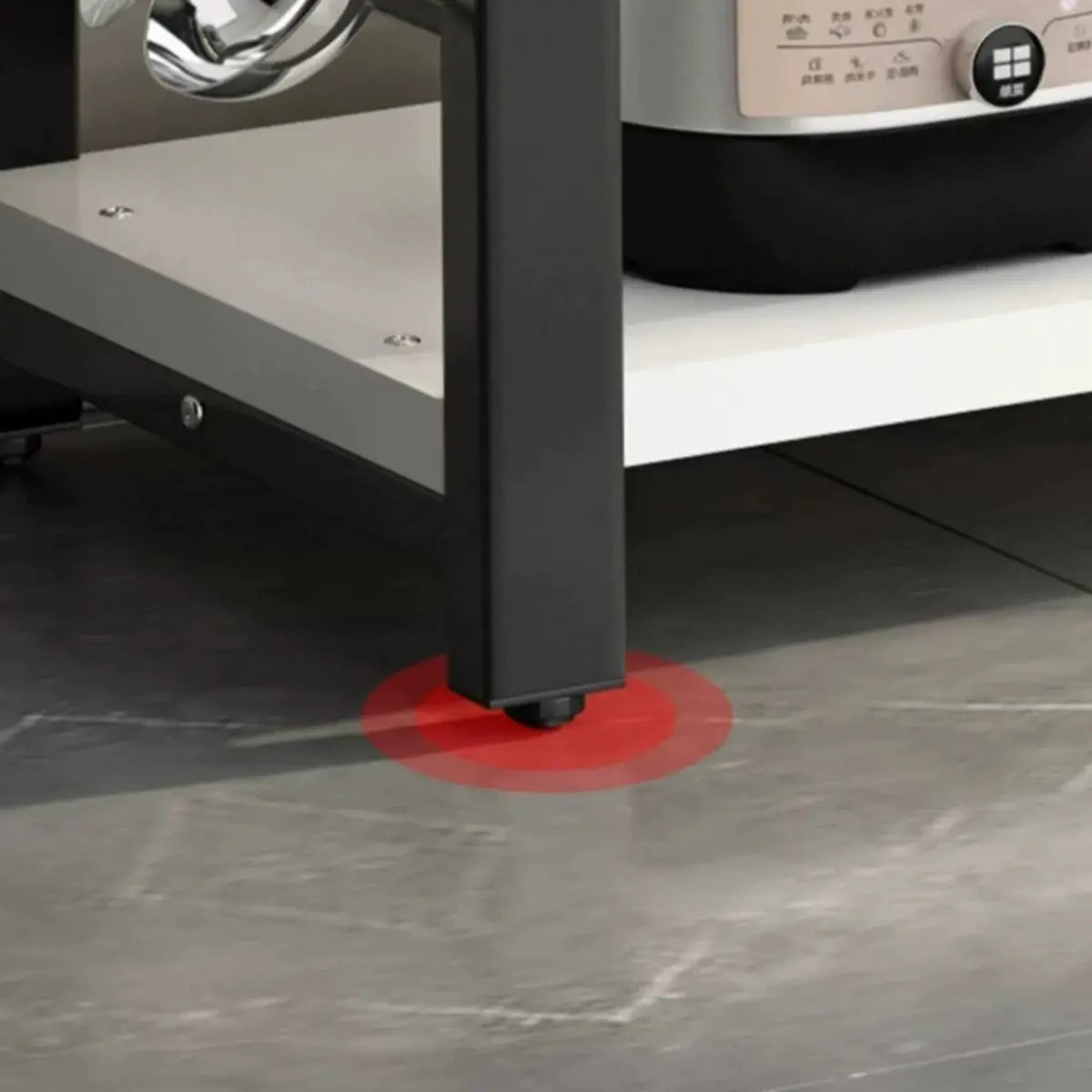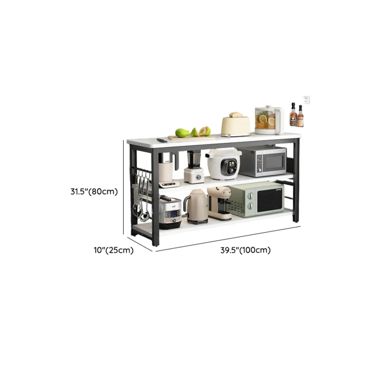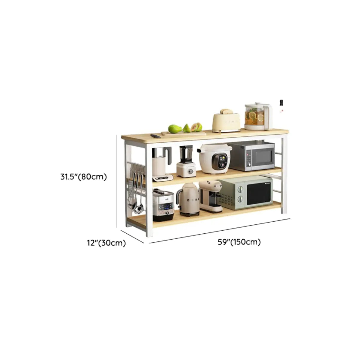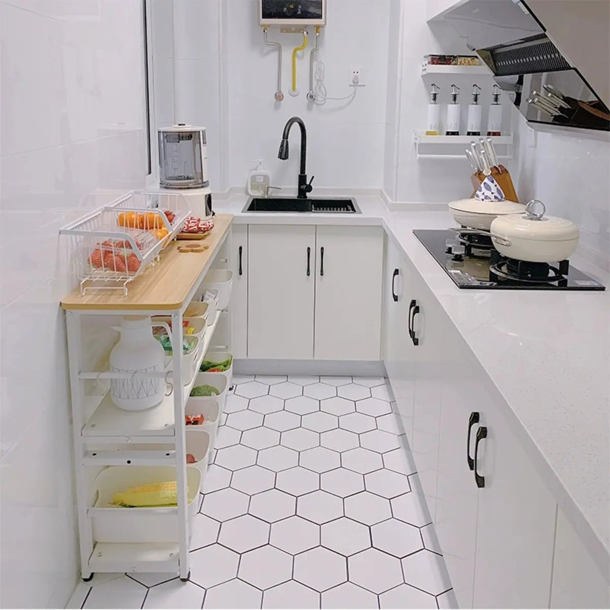 This kitchen cart offers a simple and modern design. Its rectangular shape and wooden countertop heighten a touch of nature to your kitchen. The white frame brings a fresh visual effect. Many open storage shelves can store vegetables, fruits, condiments, and other kitchen supplies. Plus, it is suitable as a preparation table for auxiliary ingredients or a simple display rack for items, effectively improving the efficiency of kitchen use.