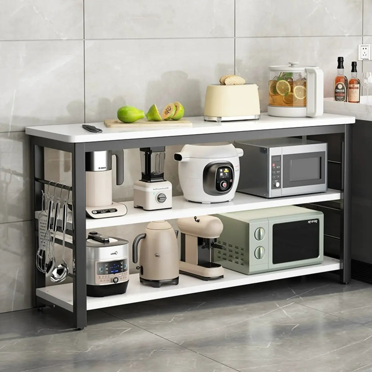 Functional Rectangle Wood White Kitchen Cart with Shelves
