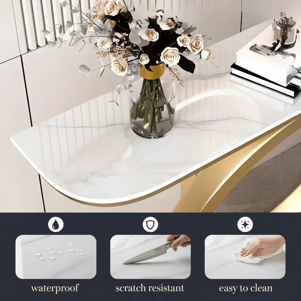 The tabletop is made from sintered stone, a material that resists scratches and heat better than standard marble. It handles the daily impact of keys and bags while maintaining a clean, polished look with minimal effort.