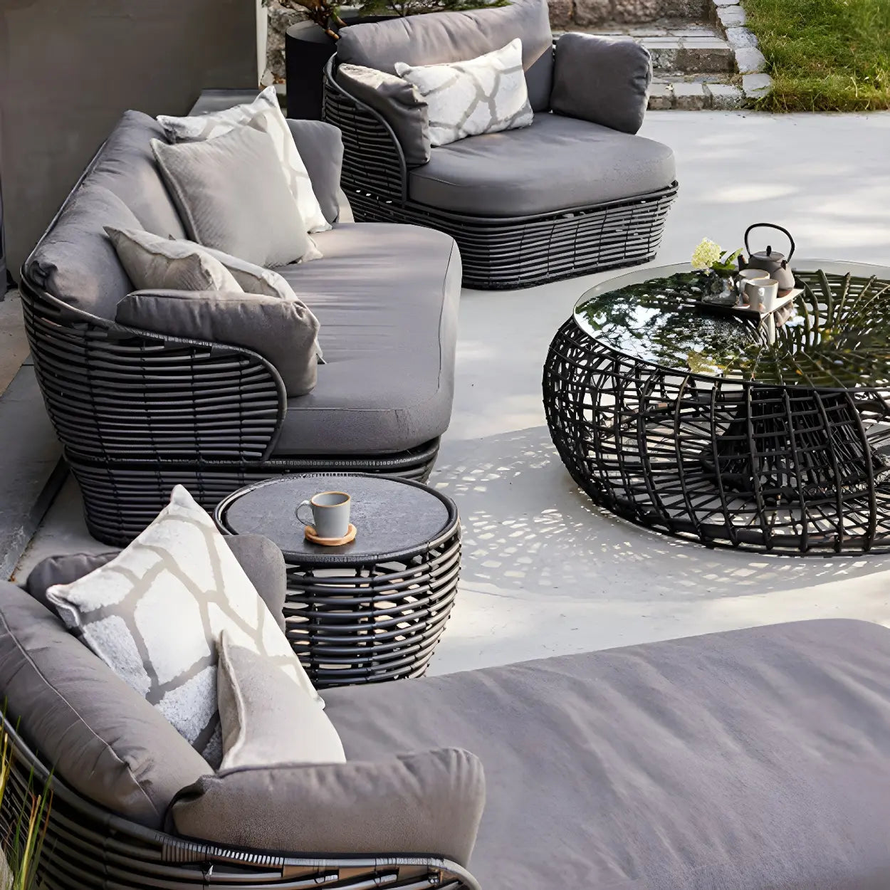The distinctive woven shape makes it a stylish and eye-catching piece of outdoor furniture.