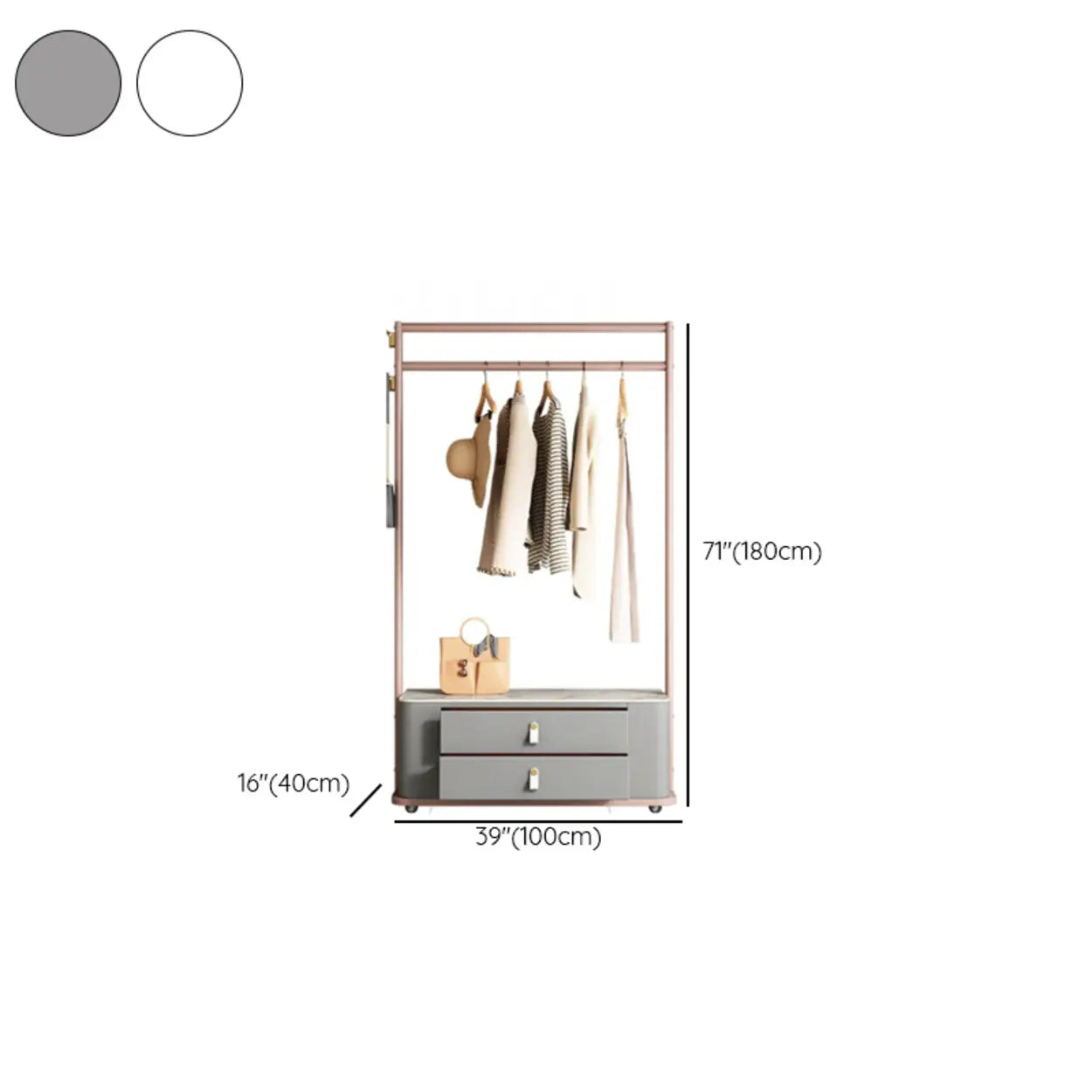 Gold Metal Frame Hooks Hall Stand with Grey Drawers - White / 24"L x 16"W x 71"H is backordered and will ship as soon as it is back in stock.