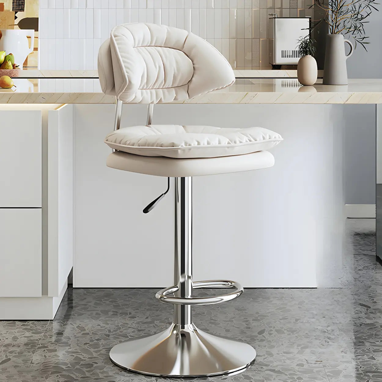 This stylish round leather bar stool adds a modern touch to your home. Selected high-quality leather and a sturdy metal base ensure long-lasting durability and stability. Whether on the kitchen island or the home bar area, this adjustable bar stool provides a comfortable seating experience.