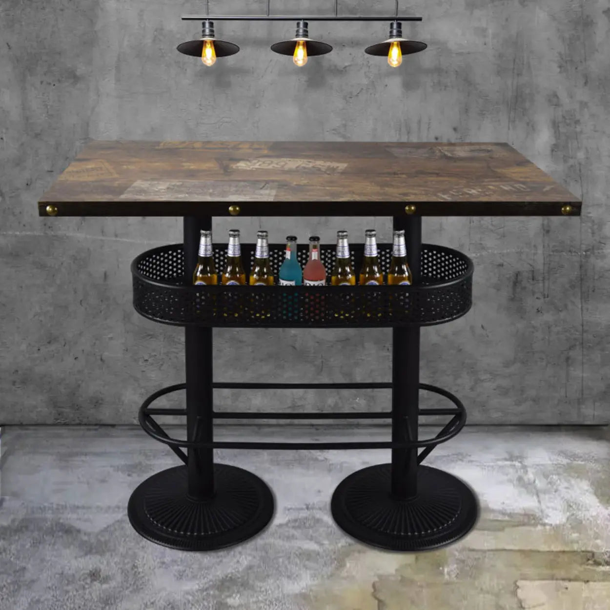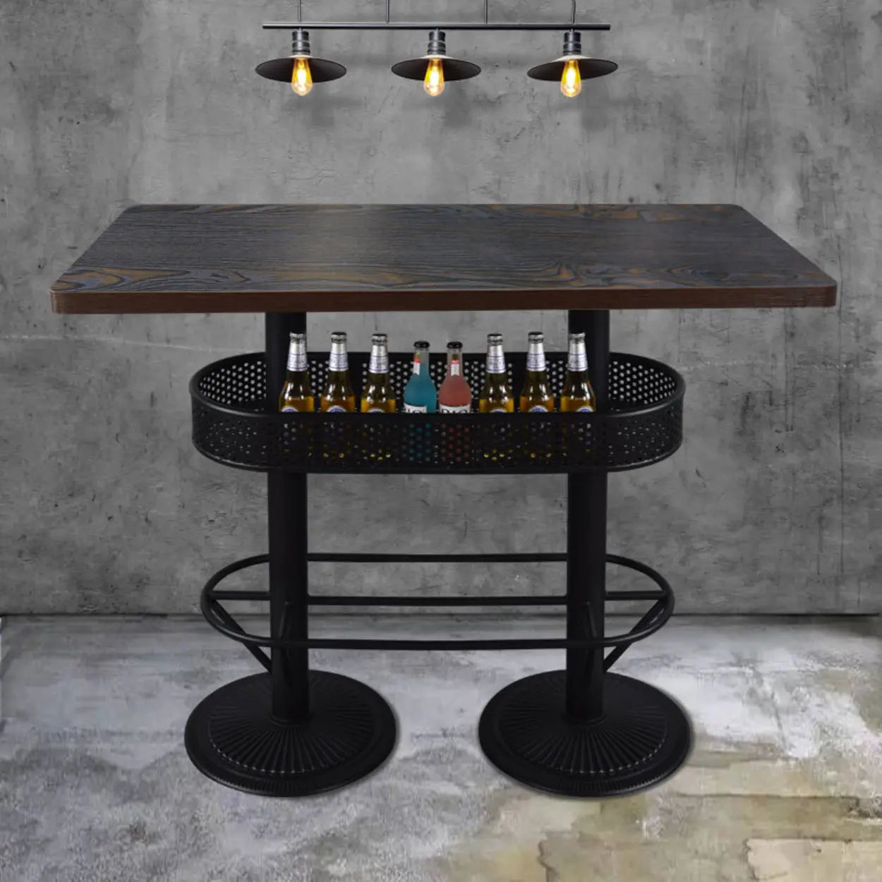 This bar table features a sturdy metal base and a practical shelf underneath the tabletop, perfect for holding bottles or bar essentials. Its modern style fits a range of interior designs and supports both home and commercial use.