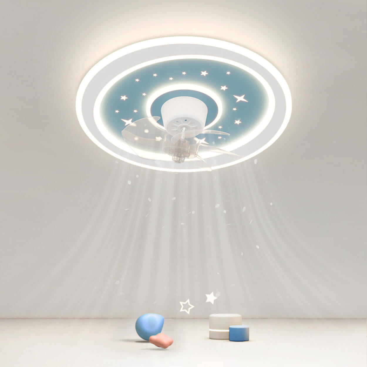 Kids Room Sleek Star-Themed Round Ceiling Fan Light - Blue is backordered and will ship as soon as it is back in stock.