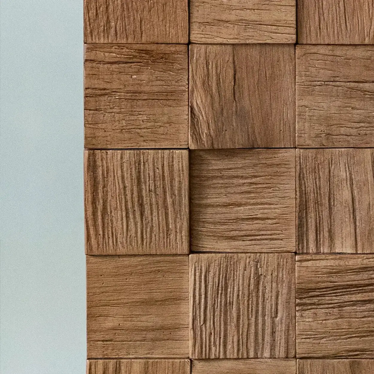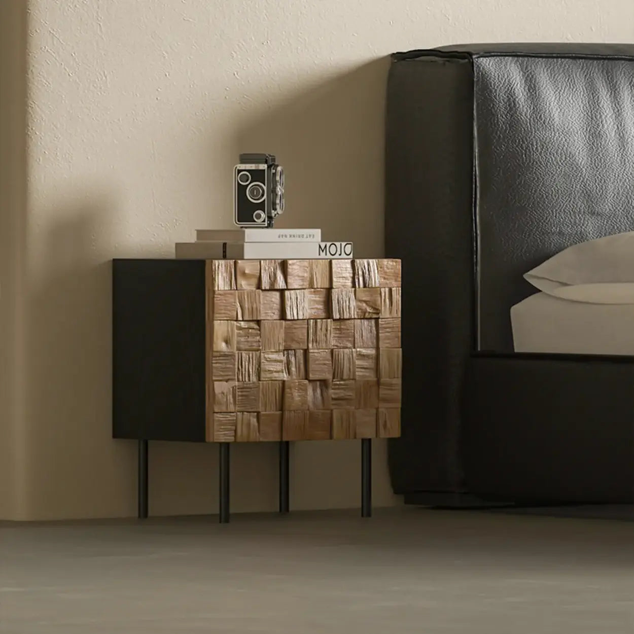 The front panel displays a unique arrangement of small textured wooden blocks that create a stunning 3D visual effect. This artistic detail adds depth and warmth to your room, making the piece a conversation starter rather than just furniture.