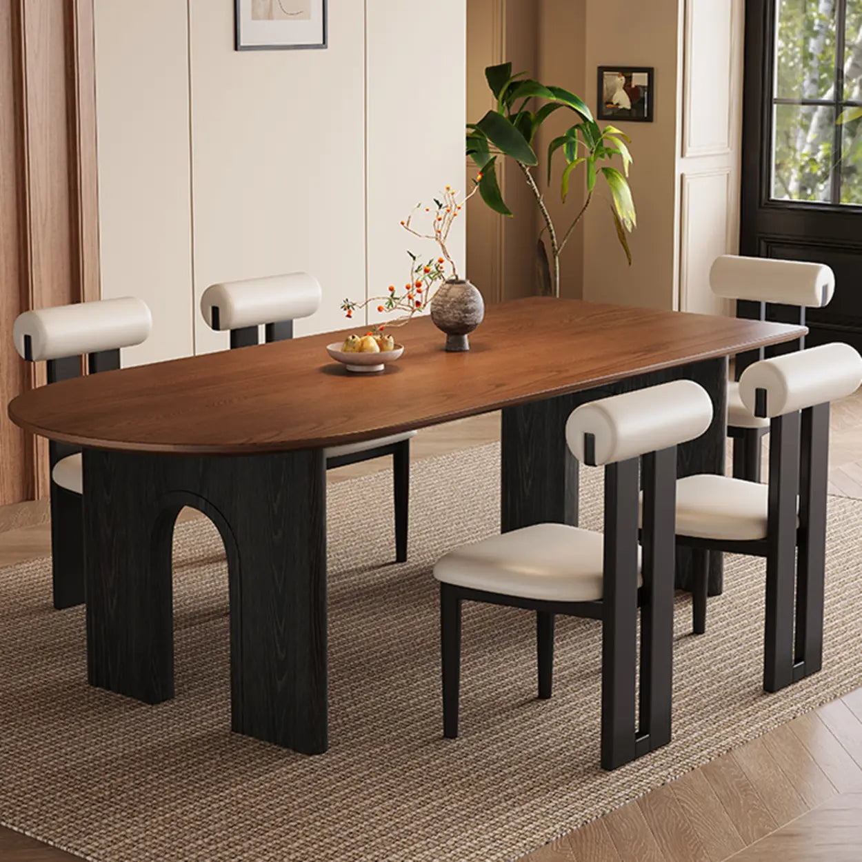 Two substantial black wooden panels feature a distinct arch cutout, adding a geometric focal point to your dining area. This wide base structure provides robust support for daily activities while ensuring ample legroom for guests seated on the sides.