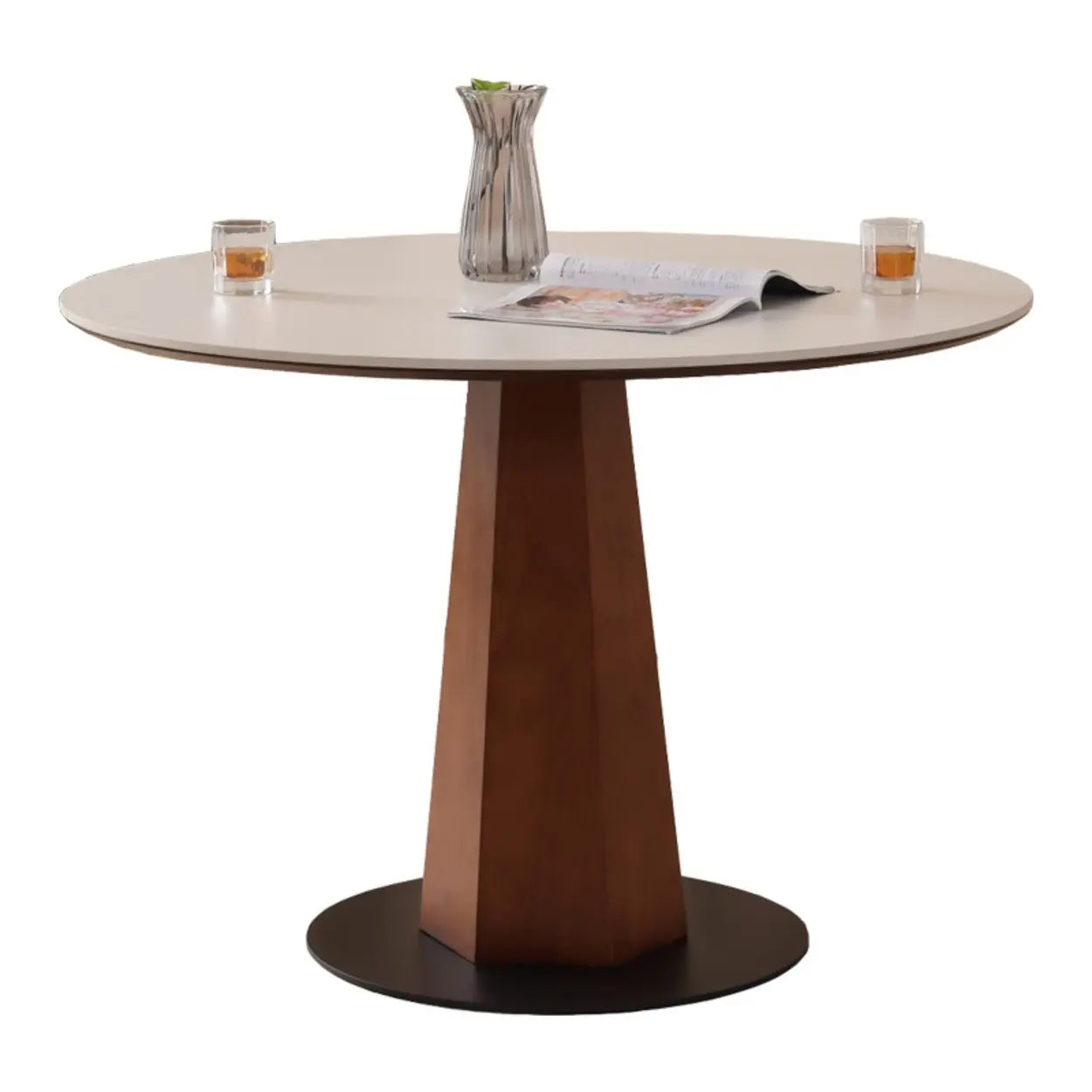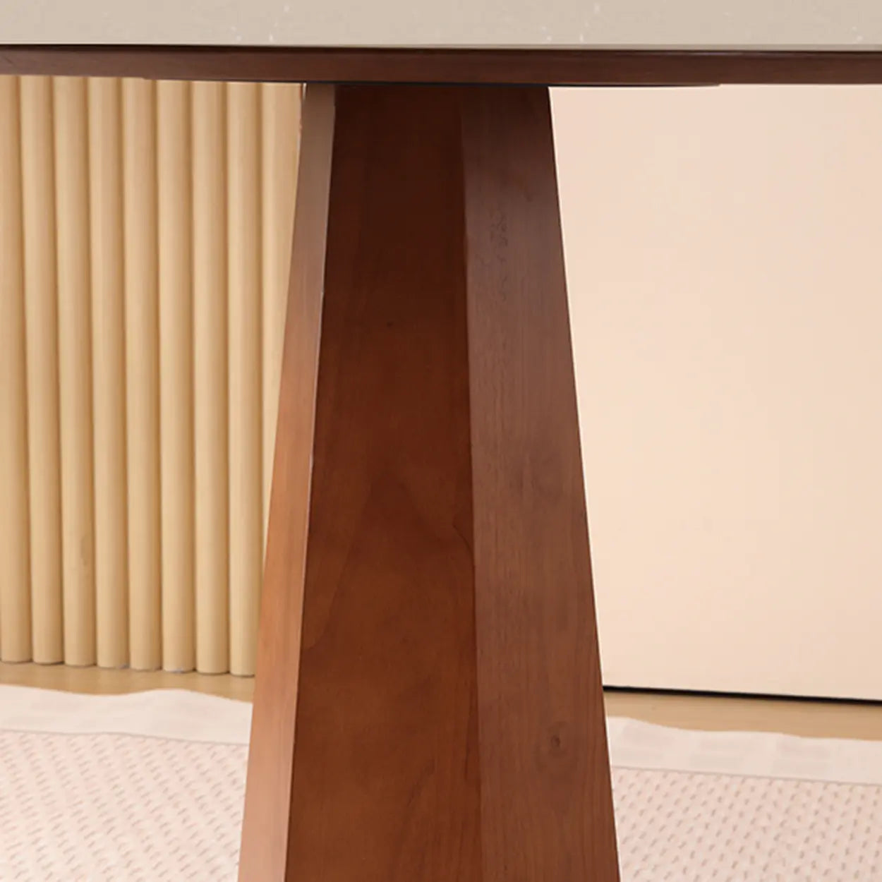 A central geometric pillar supports the table, providing a sturdy foundation that prevents wobbling during meals. This pedestal design eliminates corner legs, freeing up legroom and allowing chairs to tuck in fully for a neat appearance.