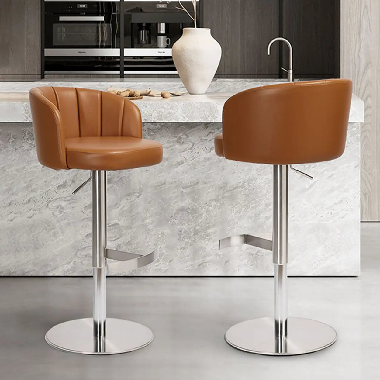 This modern bar stool features a sleek bucket-style seat with a backrest, swivel function, and adjustable height. Upholstered in smooth leather and available in Black, Gray, and Brown, it offers both comfort and easy maintenance. The sturdy metal base with a footrest provides stability and support, making it ideal for kitchen islands, home bars, or cafés.