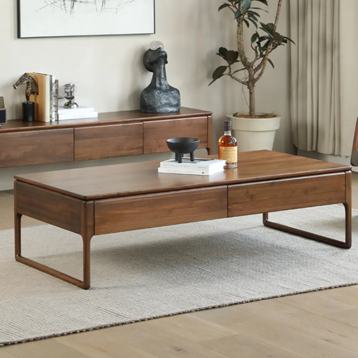 Minimalist Walnut Solid Wood Coffee Table with Drawers