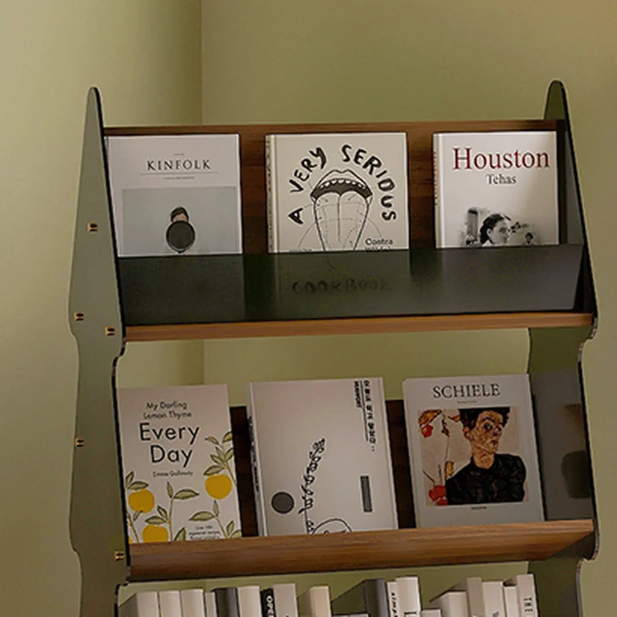 This 4-tier bookshelf features unique dark acrylic side panels with a wave design and warm wood shelves. It provides an angled display for showcasing picture books or magazines in a living room or playroom.