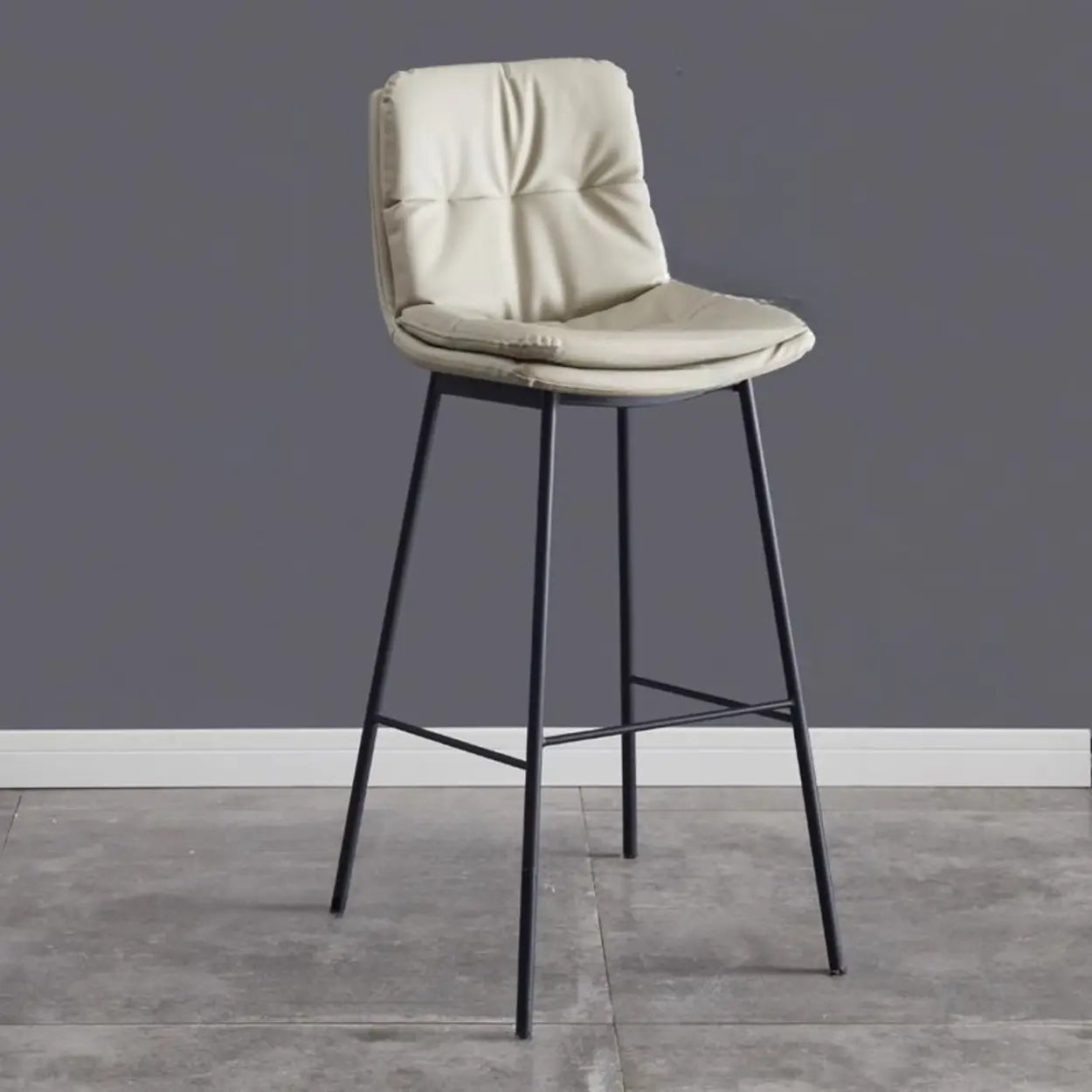 This modern bar stool features a supportive backrest and a cushioned seat upholstered in soft PU leather. It offers reliable comfort and style for any kitchen counter or high dining area.