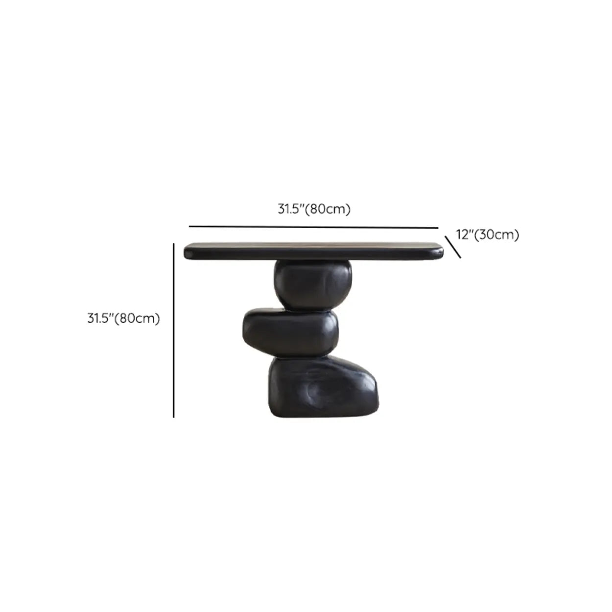 This modern sculptural console table features a bold, stacked-stone design in black wood. It serves as a functional accent piece for entryways, hallways, or living rooms while providing a distinctive look for contemporary interiors.