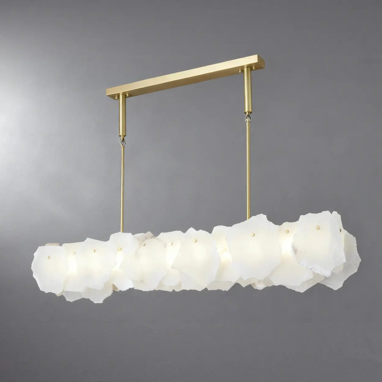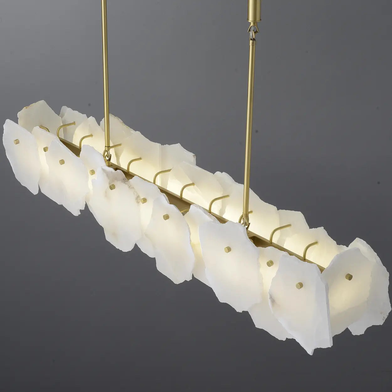 This linear island light features a contemporary brass finish adorned with natural alabaster slabs. It casts a warm, inviting glow for illuminating kitchen islands or long dining tables. The integrated LED ensures energy efficiency and bright, long-lasting light for your daily use.