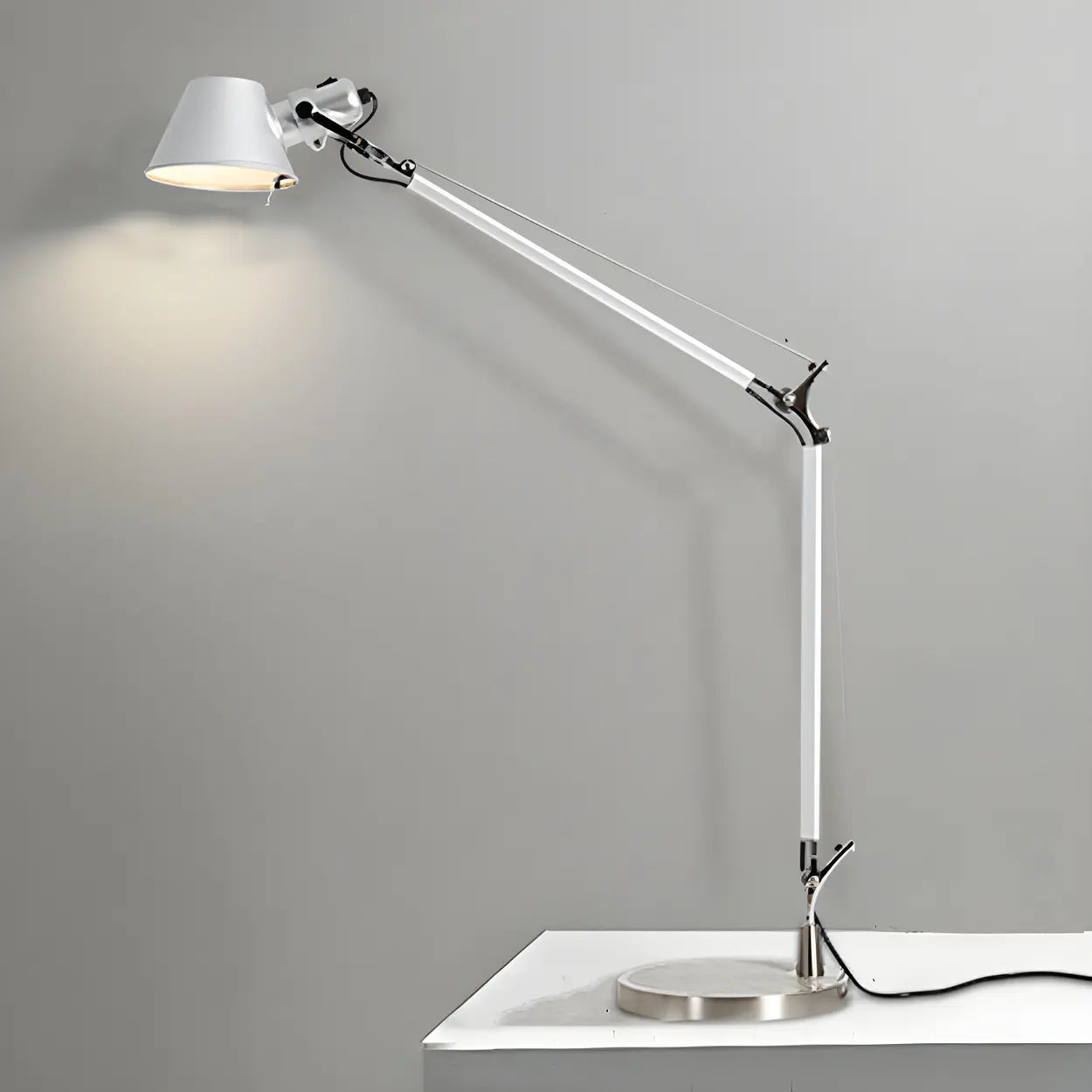 This modern mechanical arm adjustable table lamp is convenient for desk and bedroom use. Its bell-shaped lampshade design is simple and practical, providing a flexible lighting solution for your space.