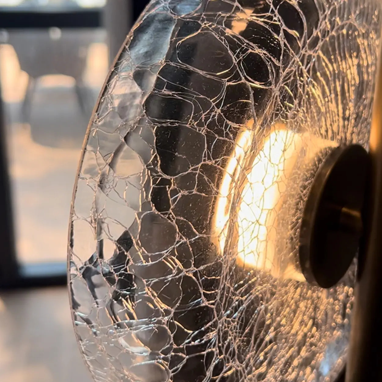 The lamp features three textured glass discs arranged vertically along a brass pole, acting as a luminous art piece. This unique design adds visual interest and vertical dimension to your room without cluttering the floor space.