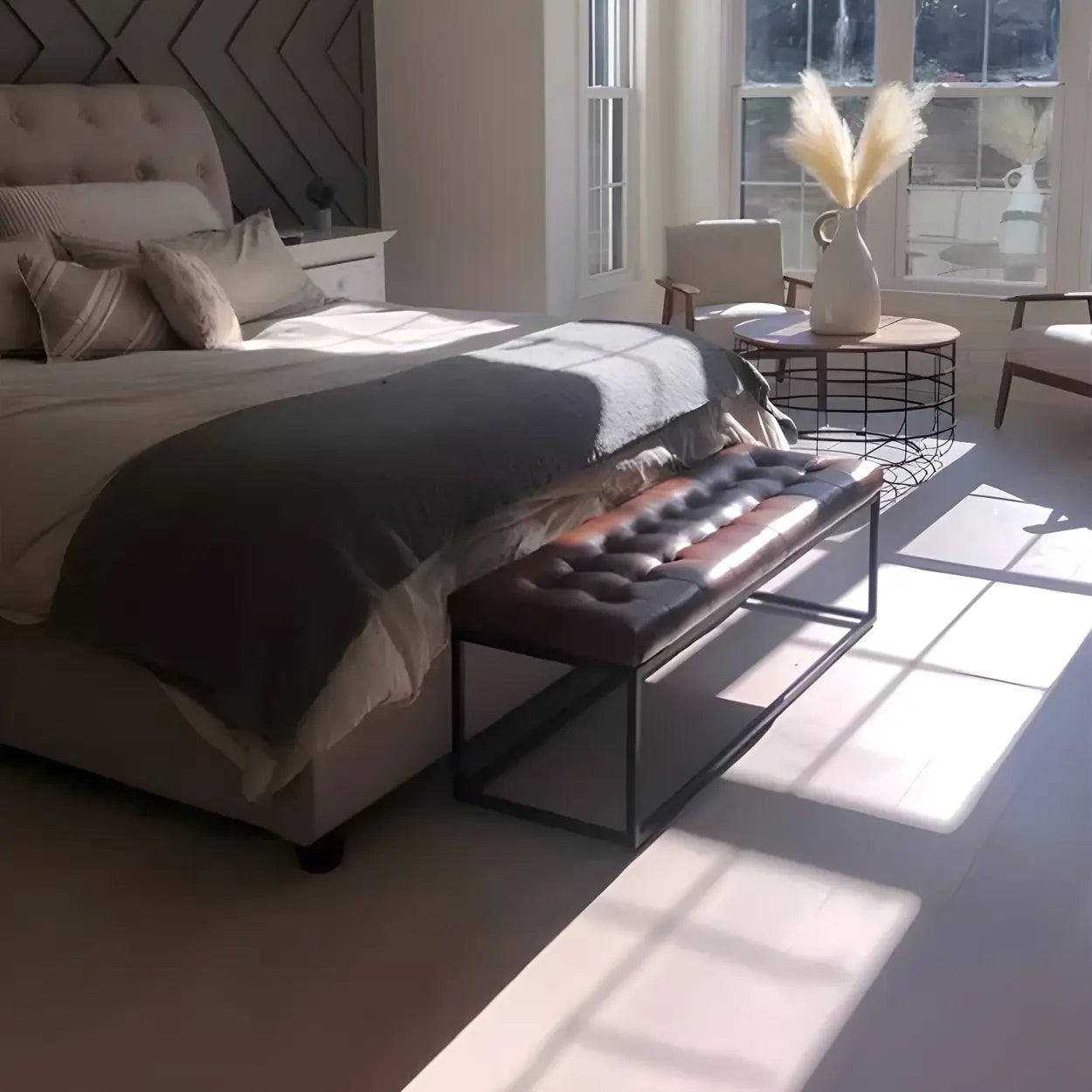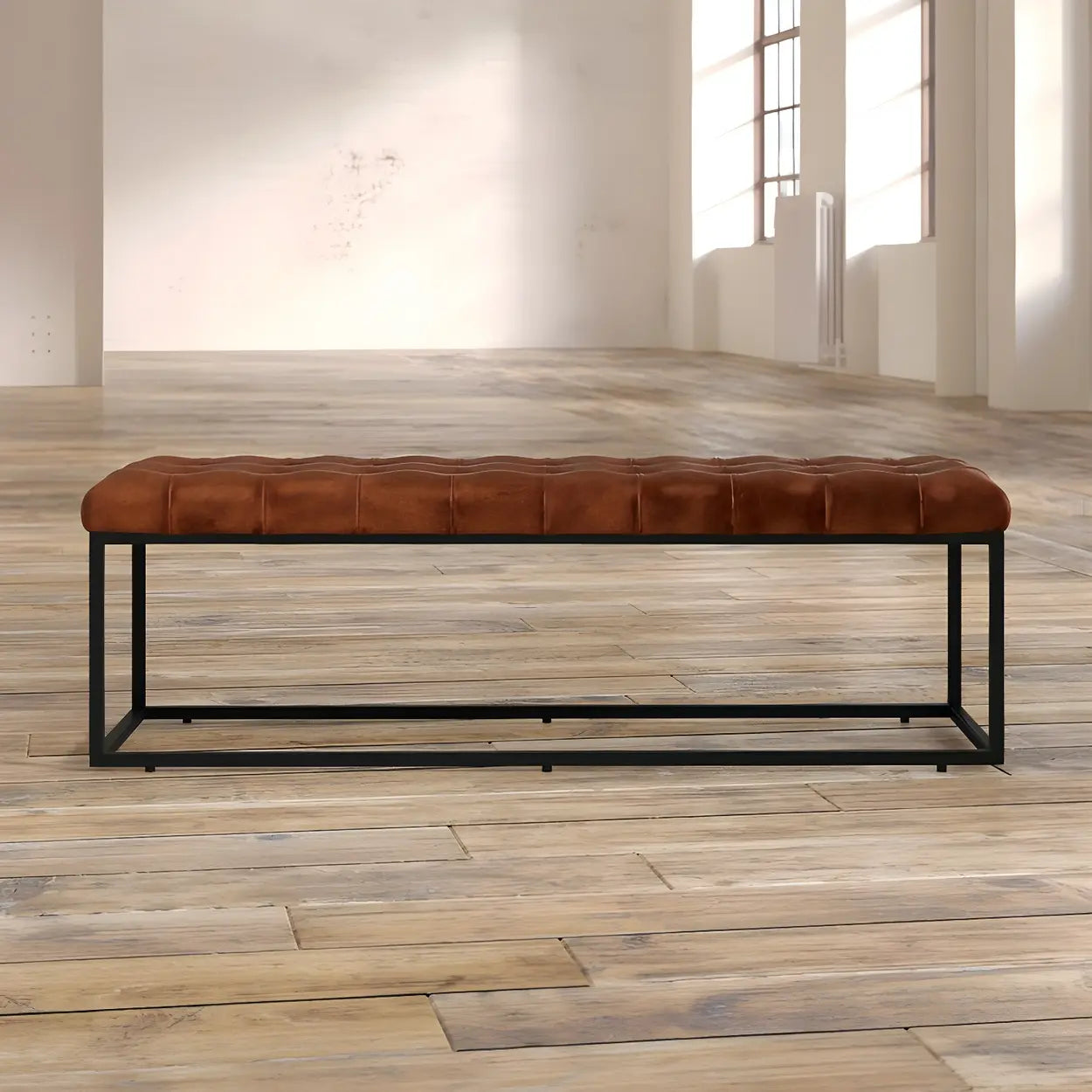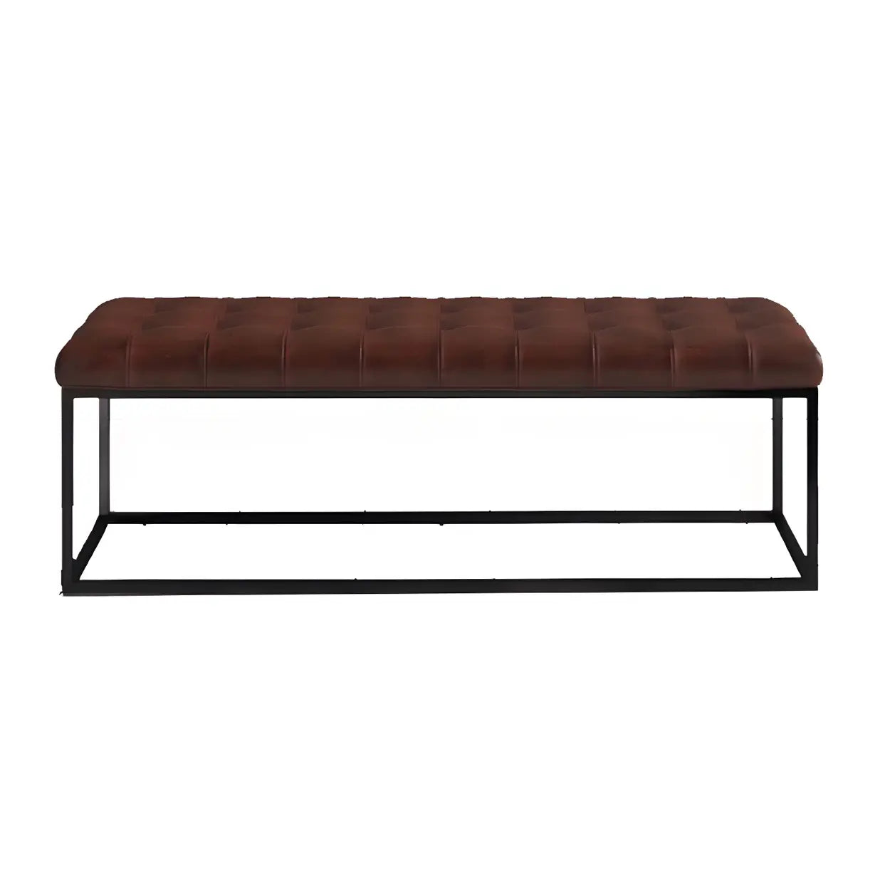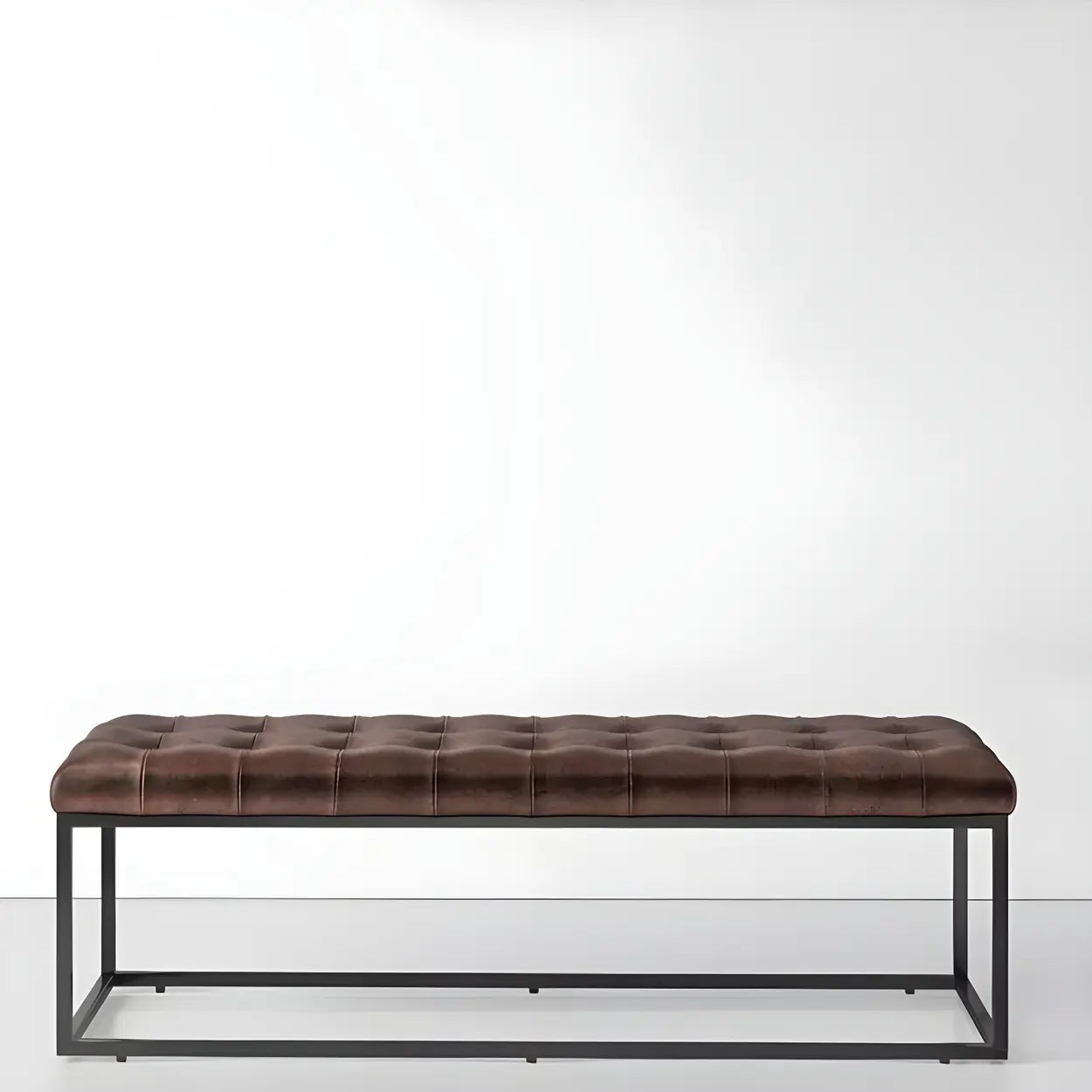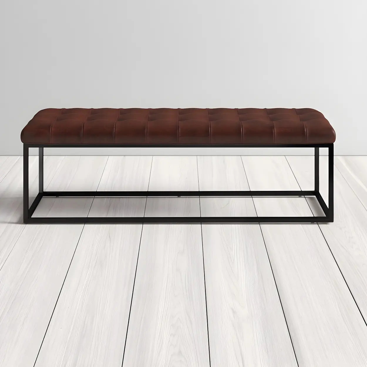 Welcome guests with this tufted leather bench. The padded seat feels soft right away, while the sleek metal frame adds a clean, modern look. Its slim shape fits entryways, bedrooms, and hallways.