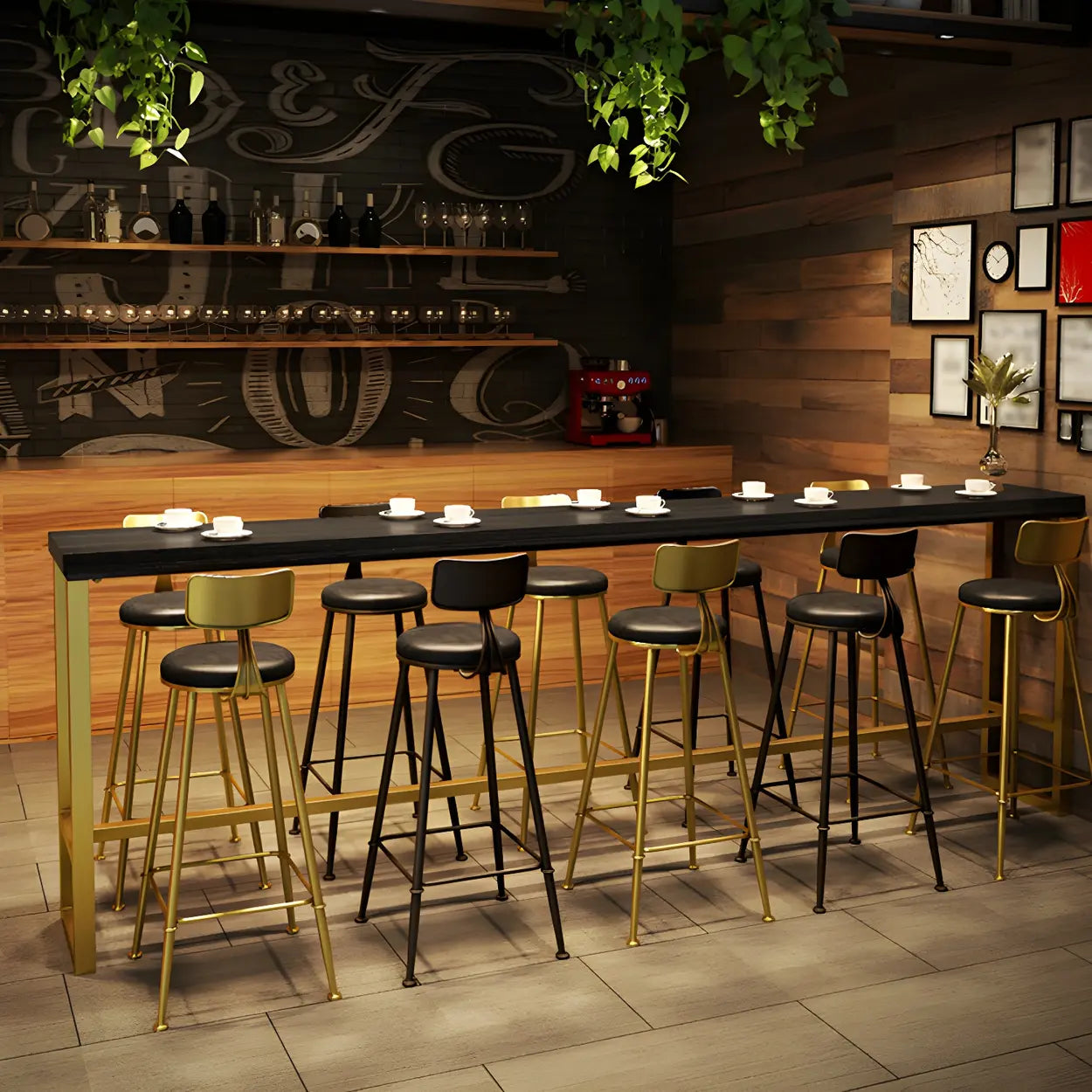 The black wood top contrasts with gold legs to create a sophisticated look. This combination adds a distinct style to your dining area or home bar.