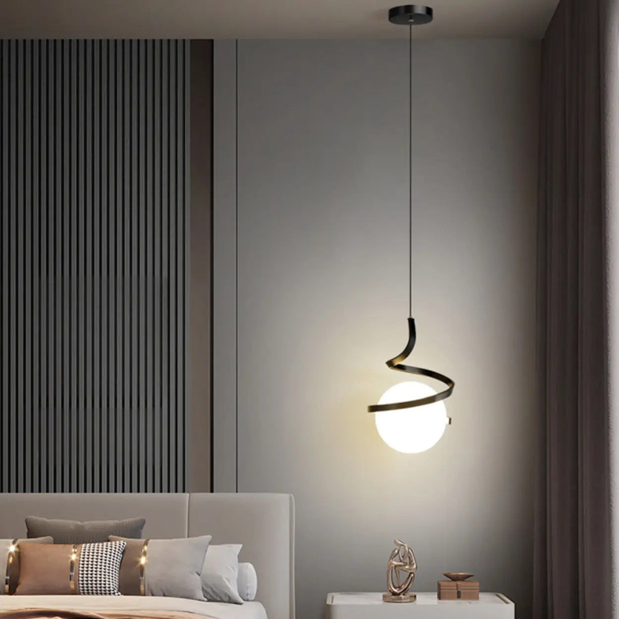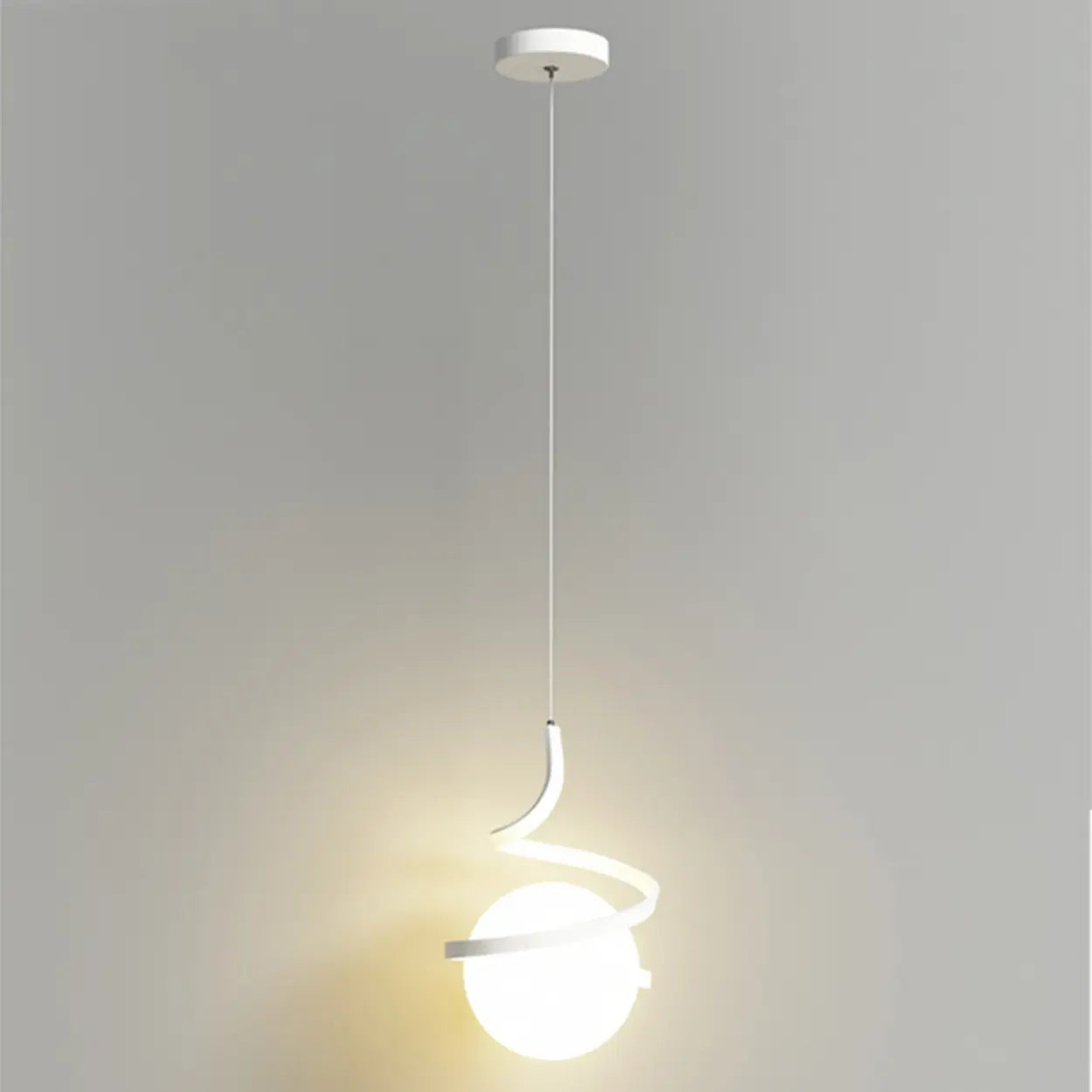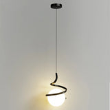 This modern pendant light features a unique spiral design in gold, surrounding a white spherical lampshade, presenting a sense of fashion and artistry. Suitable for living rooms, dining rooms, and bedrooms, it adds a unique visual focal point to the interior space.
