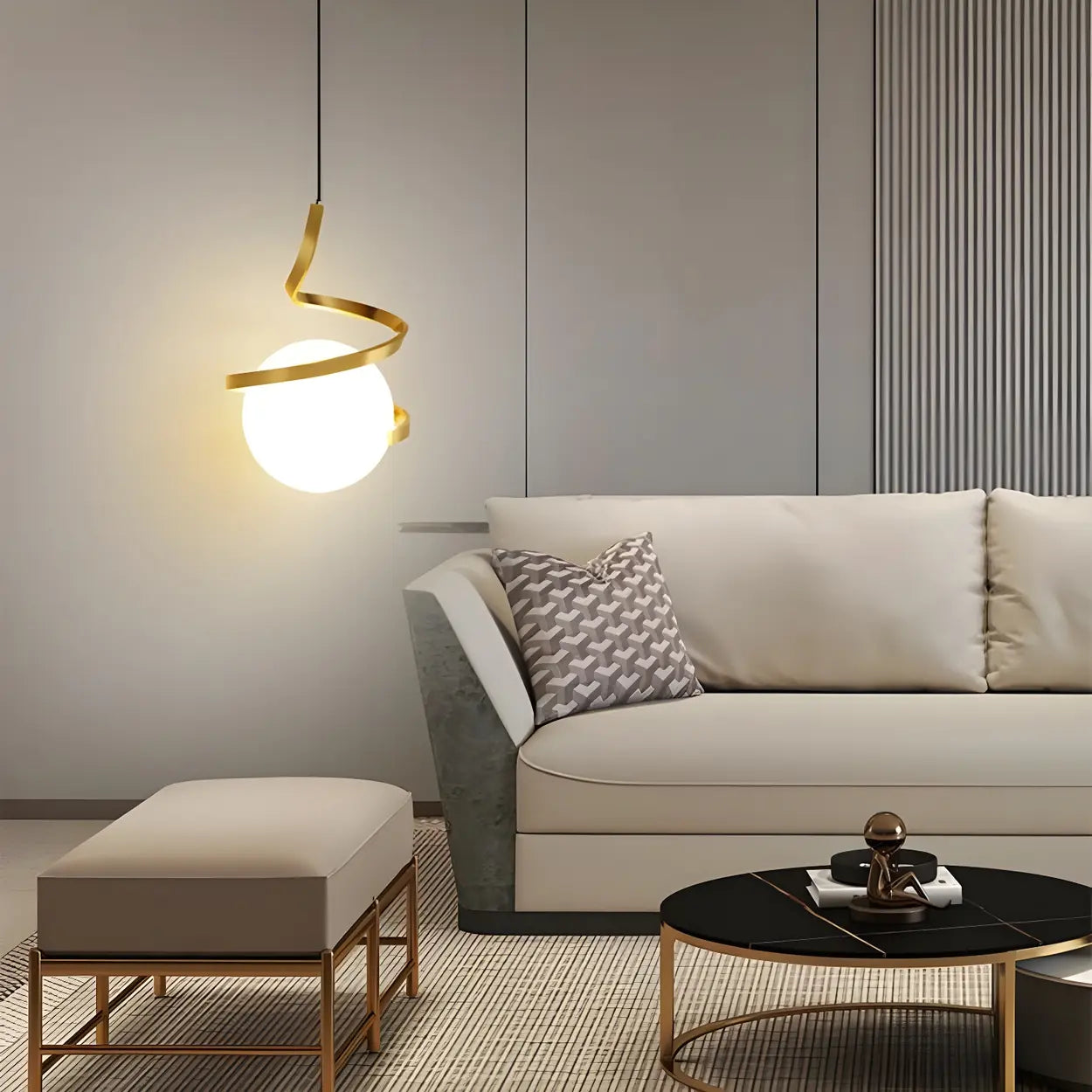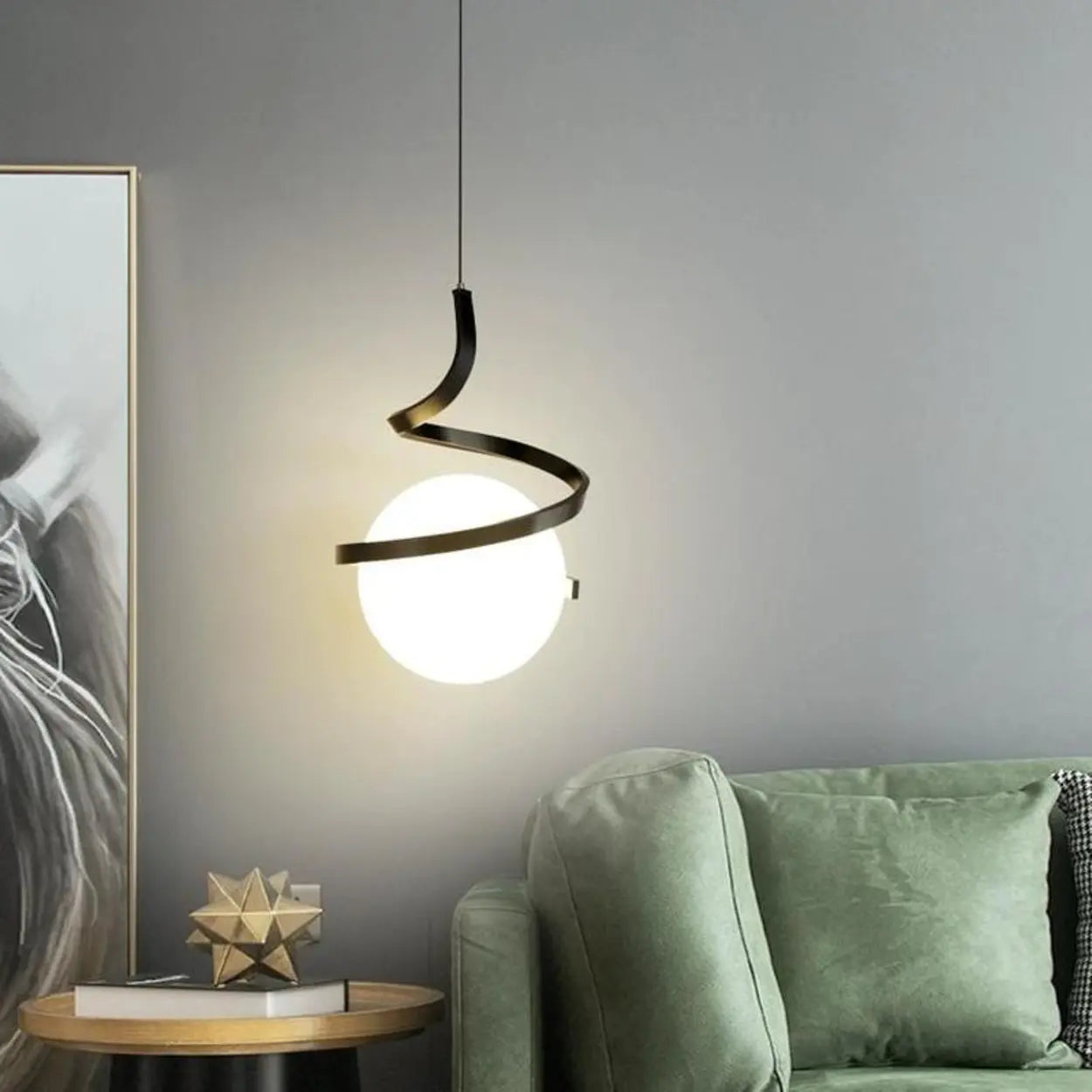 - Unique spiral design. Highlight the modern artistic style with the golden spiral structure surrounding the spherical lampshade.