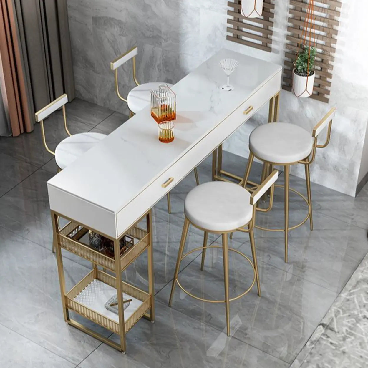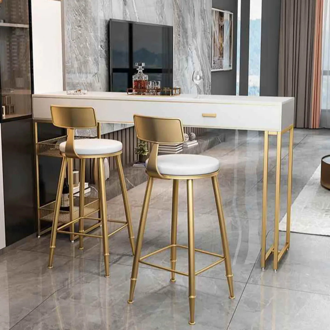 Modern Home Bar Height Table with Storage Shelves - 47.2"L x 15.7"W x 41.3"H / Marble / Table Only is backordered and will ship as soon as it is back in stock.