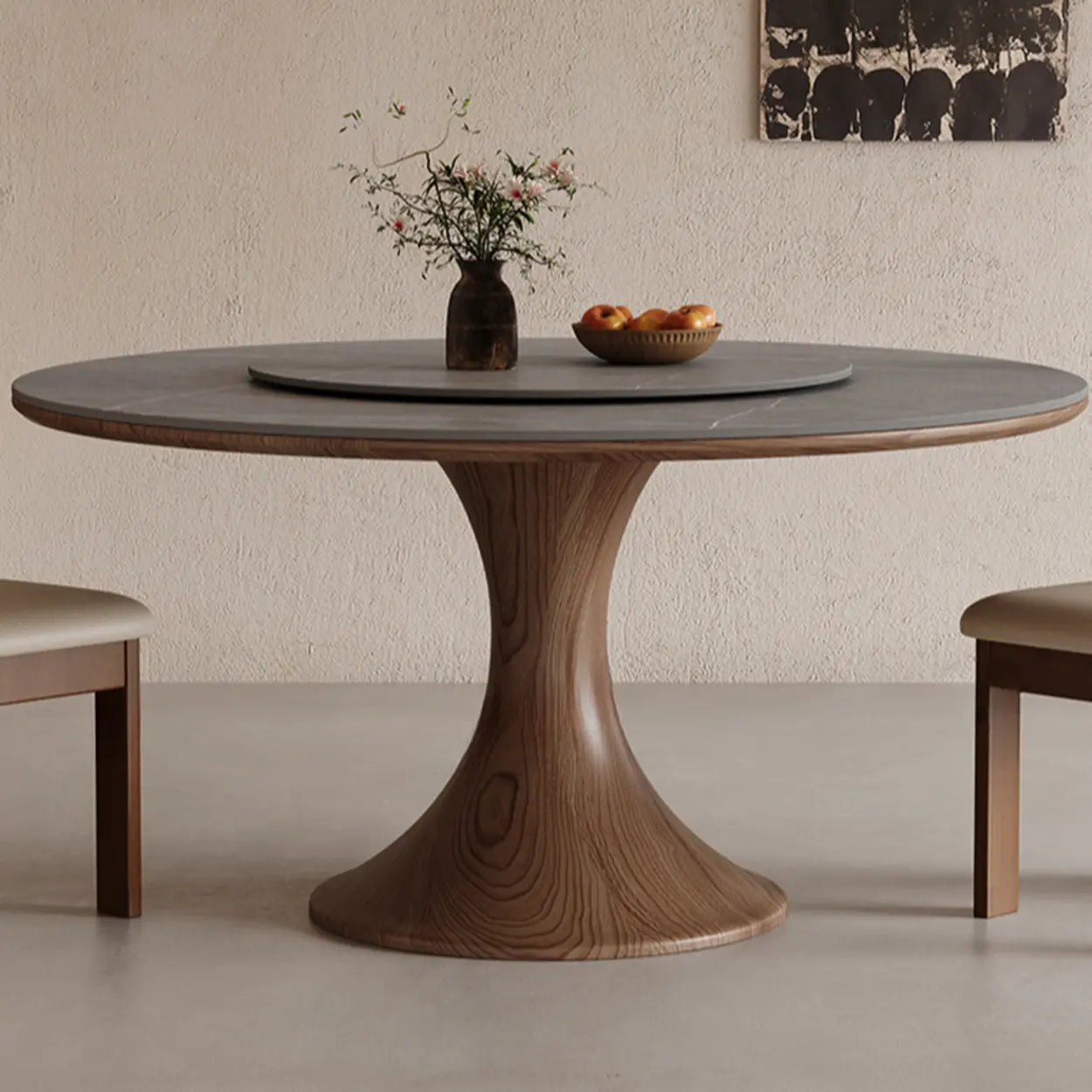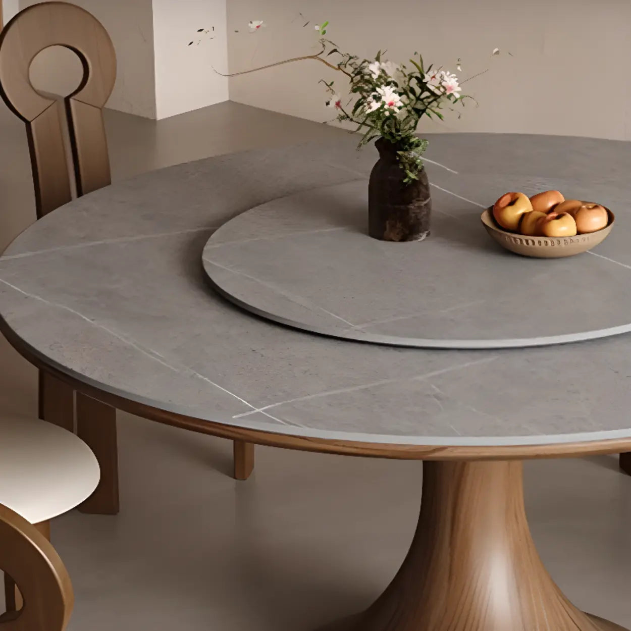 This round dining table combines a durable grey stone top with a warm wood pedestal base. Featuring an integrated lazy susan, it simplifies serving dishes during family meals.