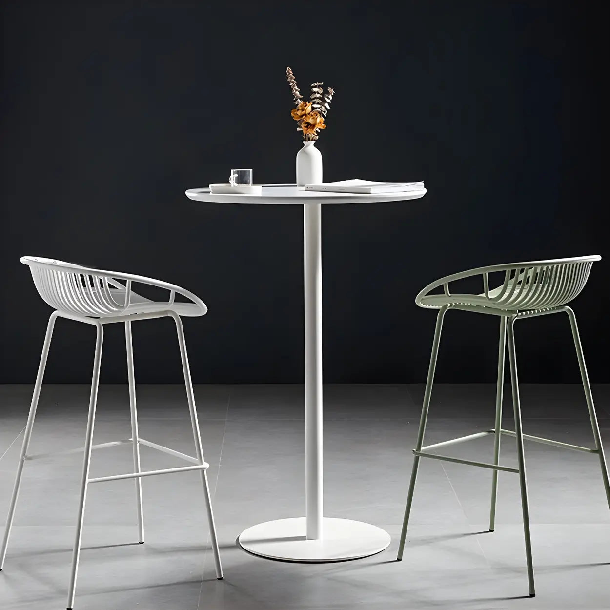 Modern Natural Round Wood Steel Small Bar Table - 23.6"L x 23.6"W x 41.3"H / White / Table Only is backordered and will ship as soon as it is back in stock.