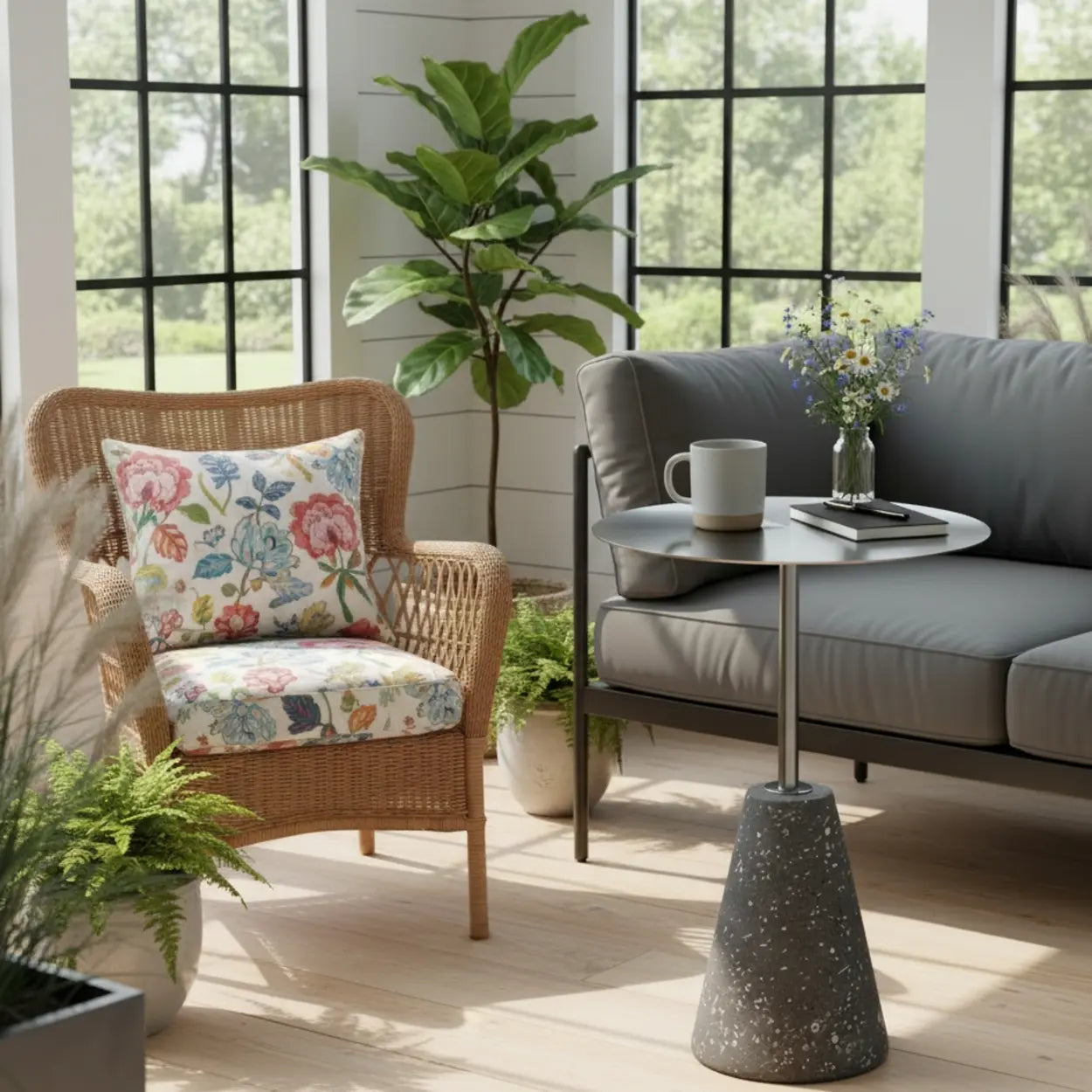 The solid terrazzo cone establishes a highly stable foundation for your outdoor patio furniture. This dense speckled stone base prevents the side table from accidentally tipping over during active backyard gatherings or windy afternoons.