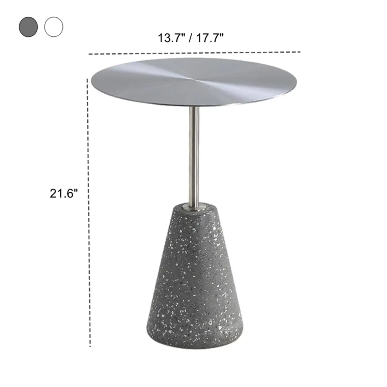This modern round side table offers a dedicated surface for your outdoor garden or patio seating. A smooth stainless steel top and a solid terrazzo base combine to securely hold your breakfast pastries or afternoon tea.