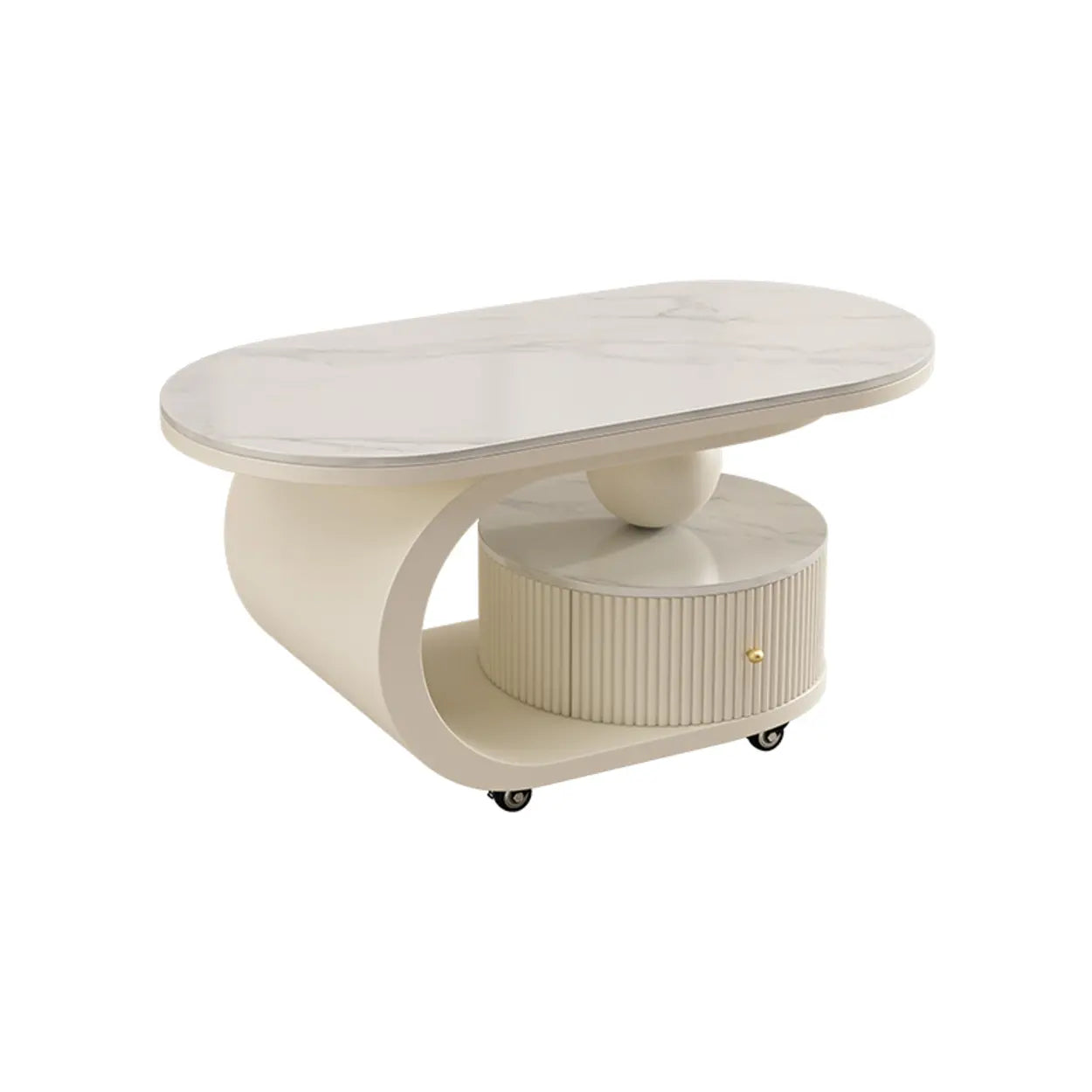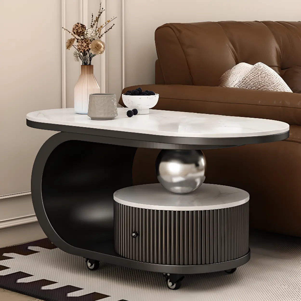 Modern Oval Stone Top Side Table with Casters and Drawers