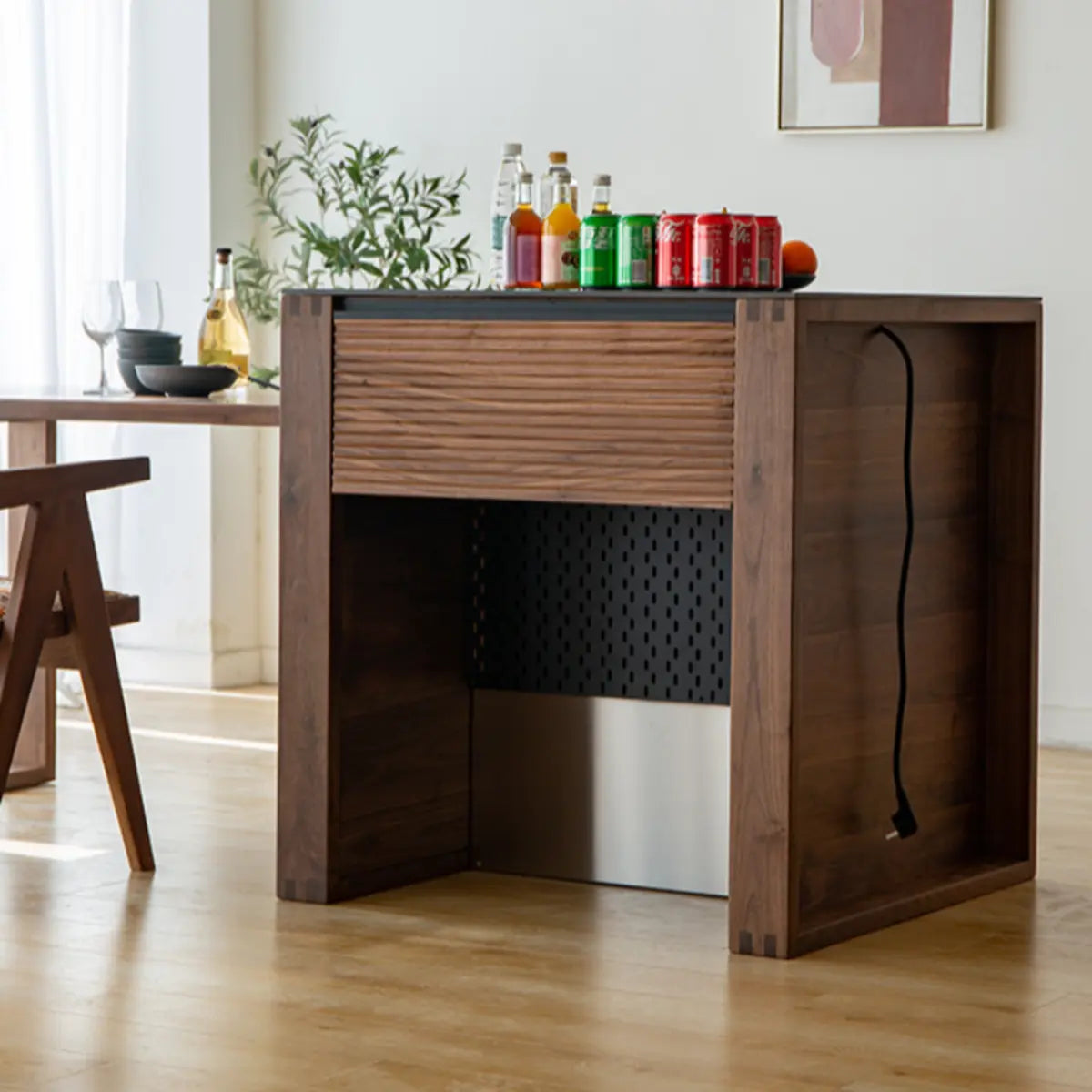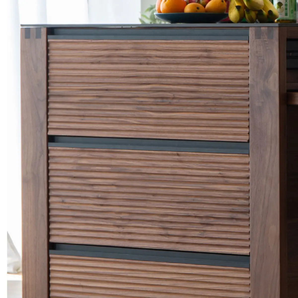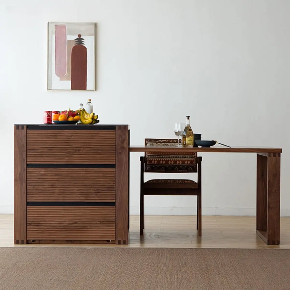 This modern kitchen island uses excellent walnut wood, combining practicality and beauty. Its unique rectangular design and large black countertop give ample workspace and heighten a stylish touch. Drawers give a convenient storage solution for your kitchen utensils and other items, organizing your space efficiently.
