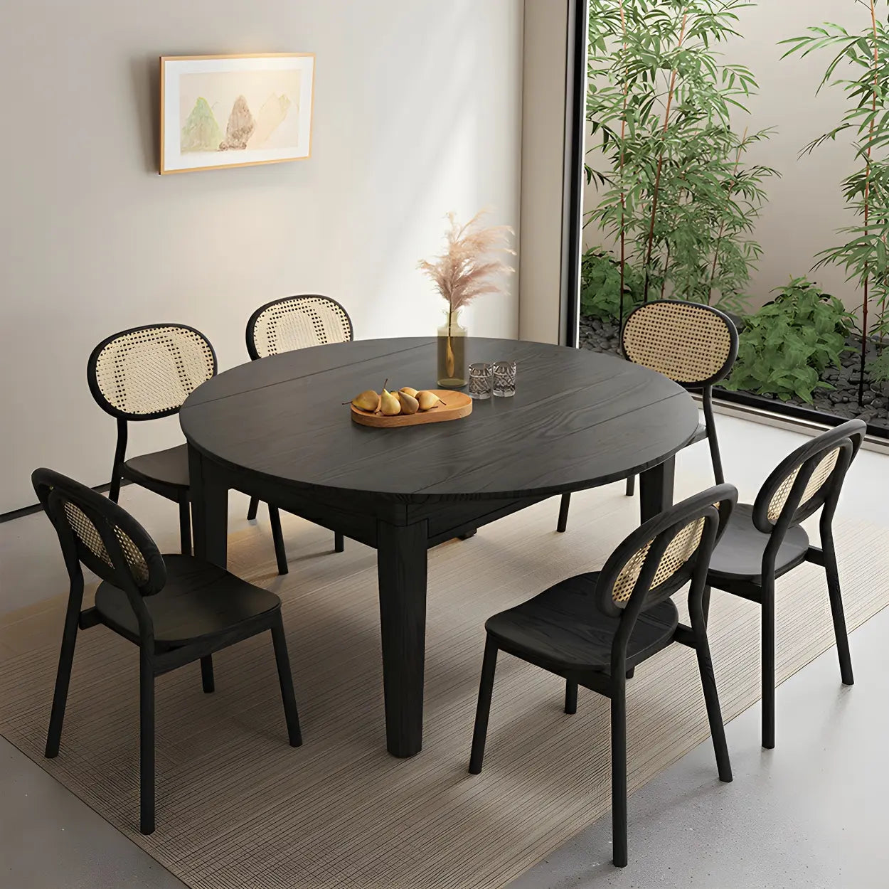 This modern round black wood ash dining table is crafted from high-quality materials, adding both elegance and modernity to your dining space. The expandable design allows you to easily seat more guests. The built-in self-storing blade mechanism makes the table expansion hassle-free. The wood ash material is known for its excellent durability and beautiful grain, ensuring that it will maintain its classic beauty over the years.