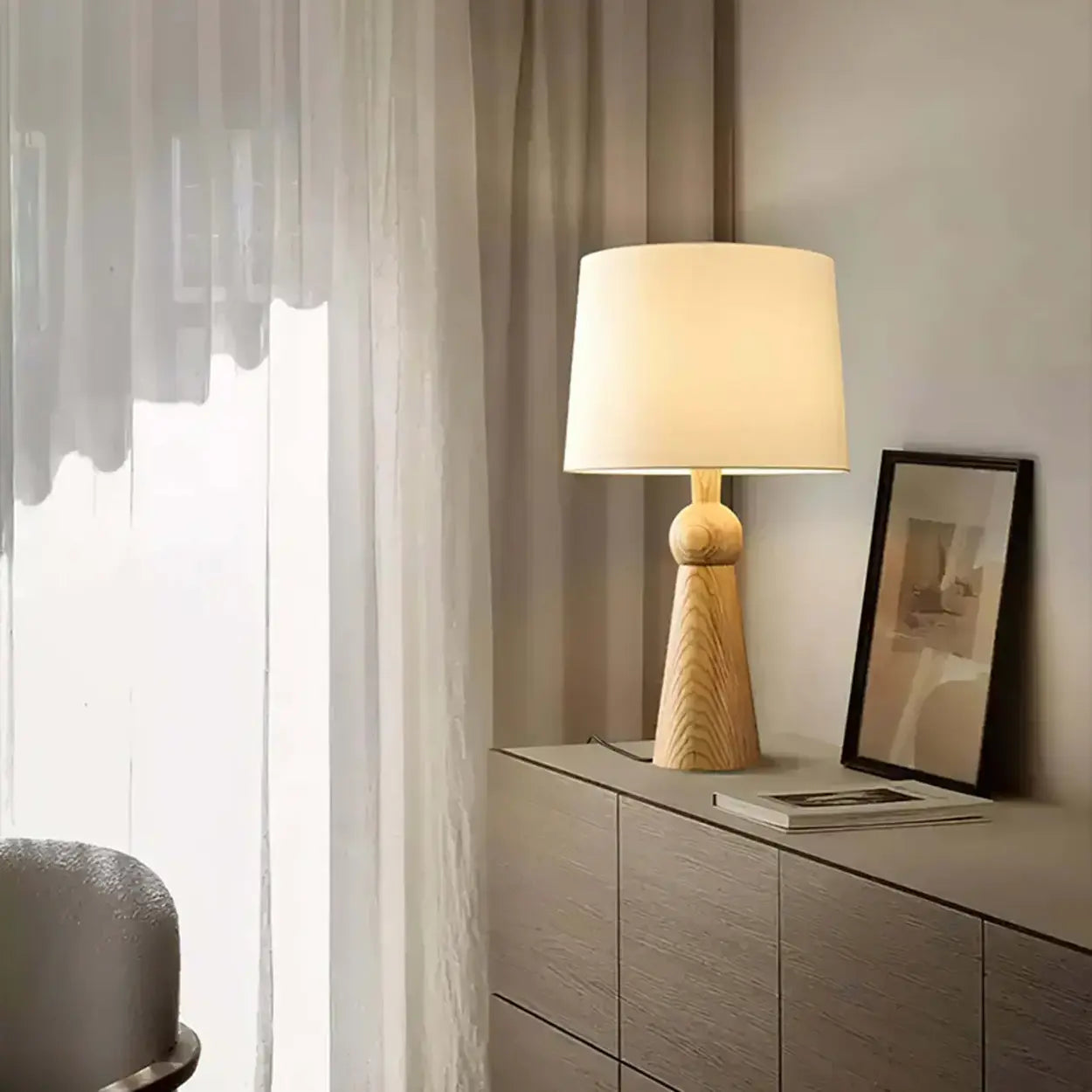 This table lamp features a geometric solid wood base paired with a fabric drum shade. Ideally sized for side tables, it introduces a mid-century modern aesthetic to your interior.