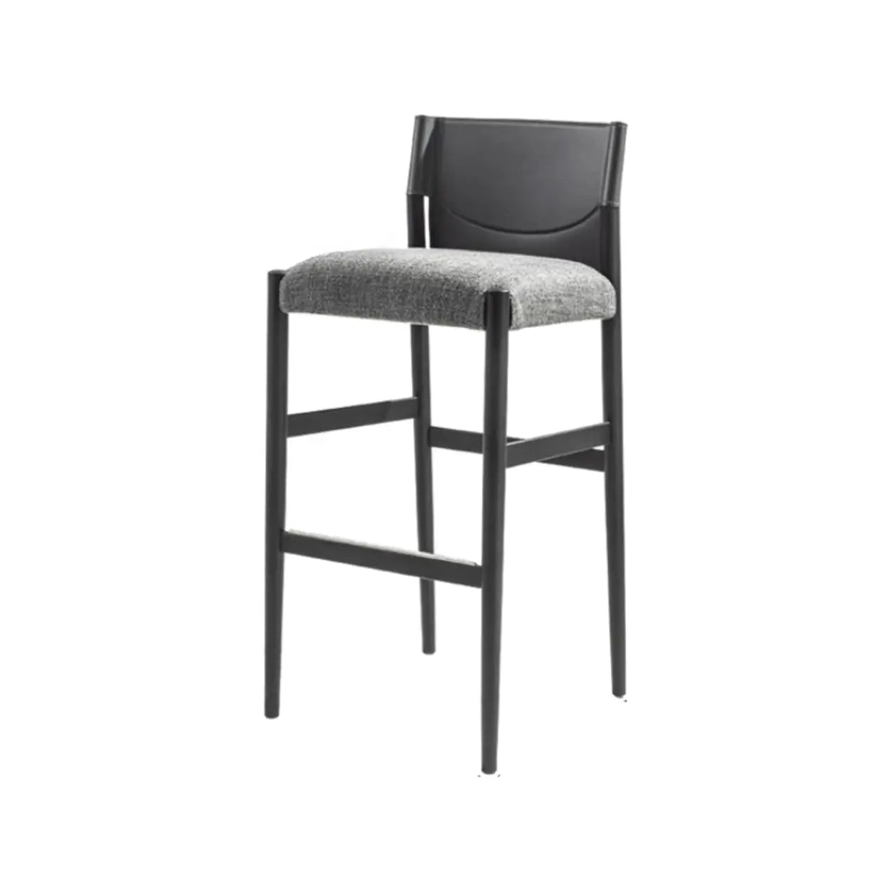 This bar stool features a sturdy metal frame paired with a cushioned fabric seat. Its sleek design fits seamlessly into both home kitchens and business environments, providing reliable comfort and modern style for everyday use.