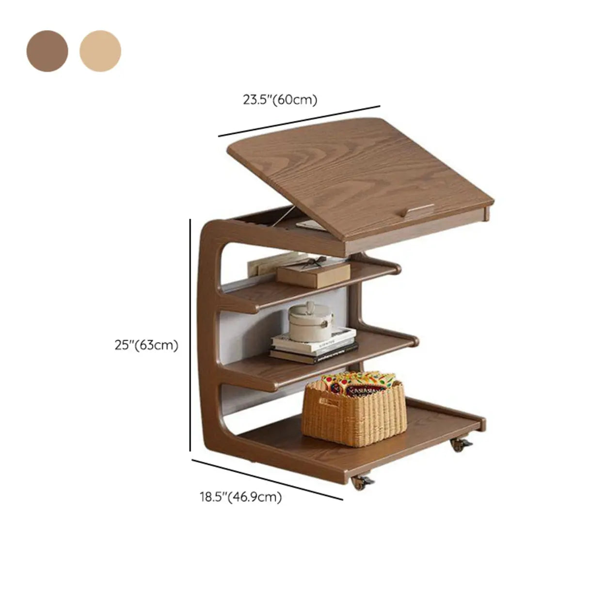 Multi-Tier Brown Wooden Side Table with Storage and Wheels - Nut/Brown / 16"L x 18"W x 25"H is backordered and will ship as soon as it is back in stock.
