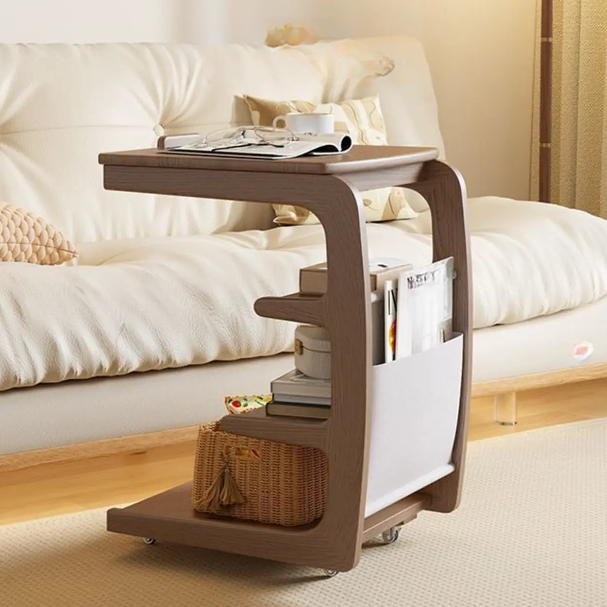Multi-Tier Brown Wooden Side Table with Storage and Wheels