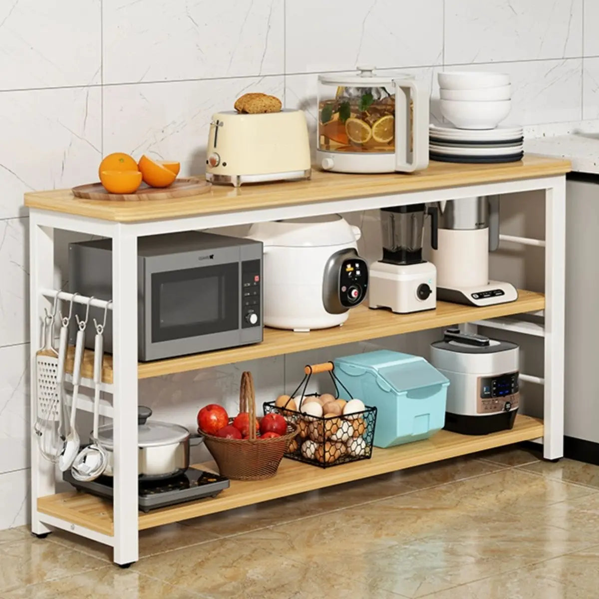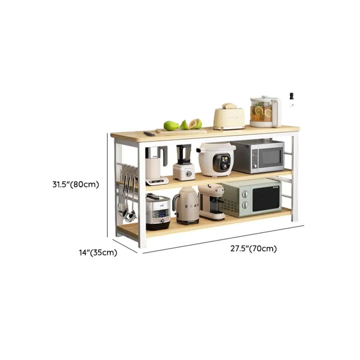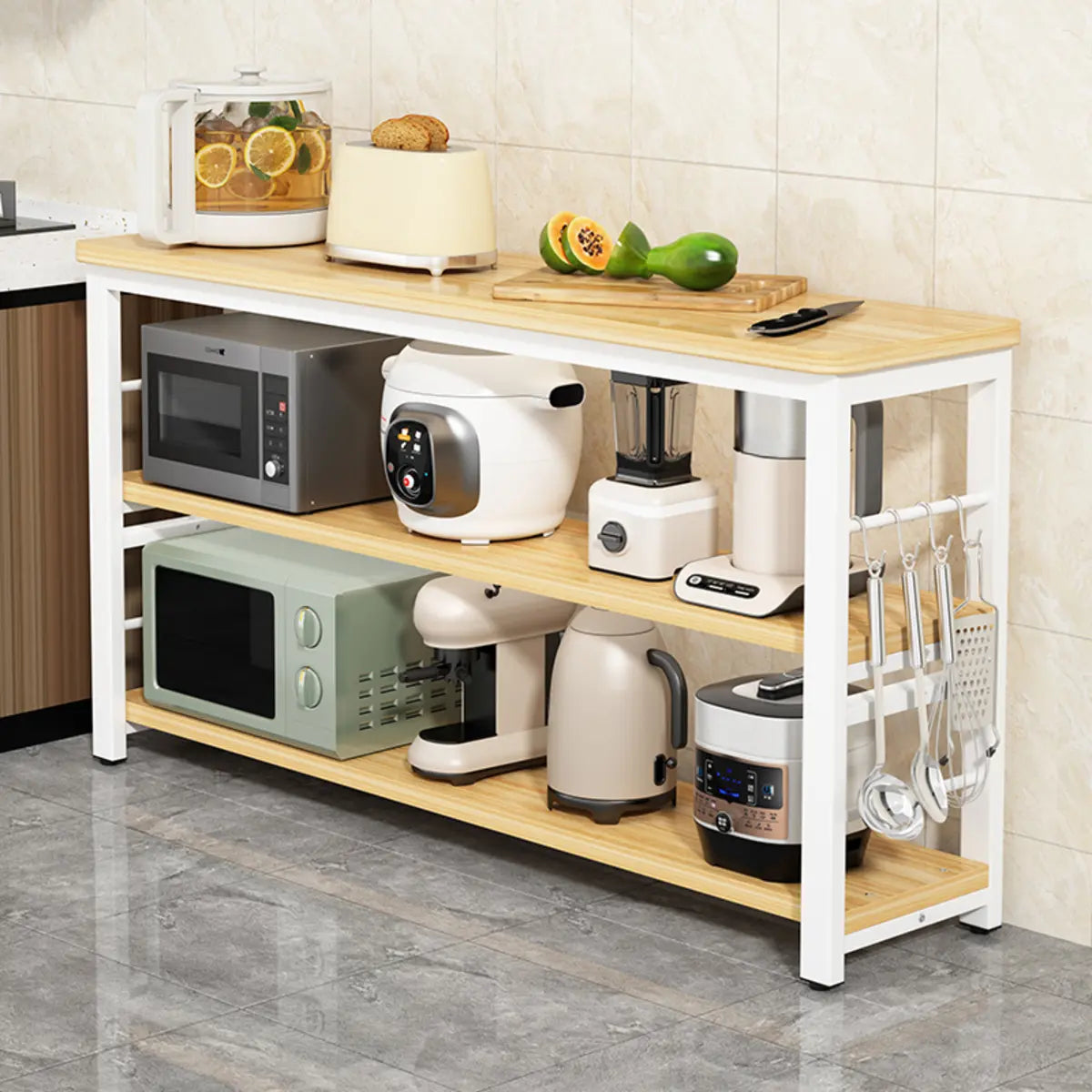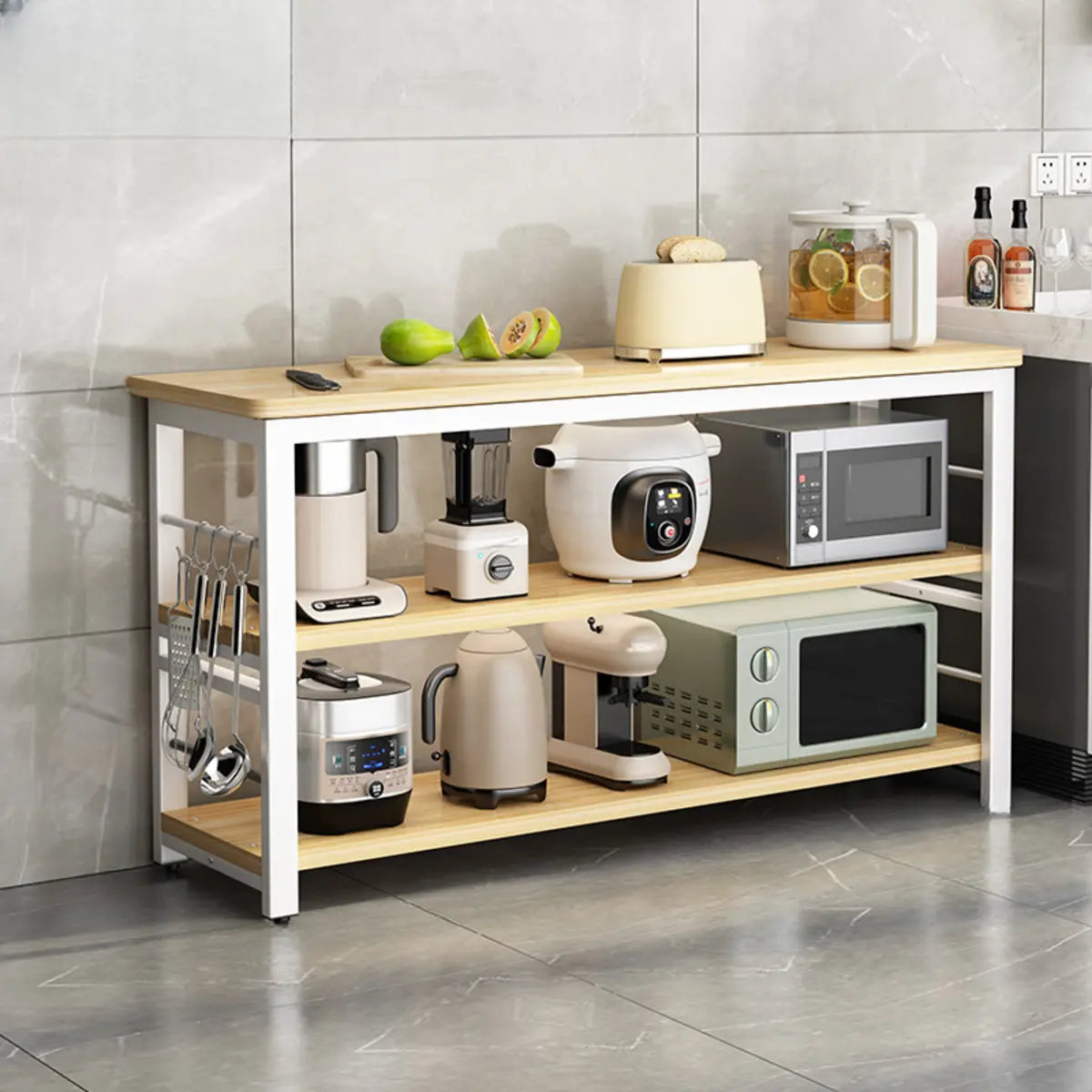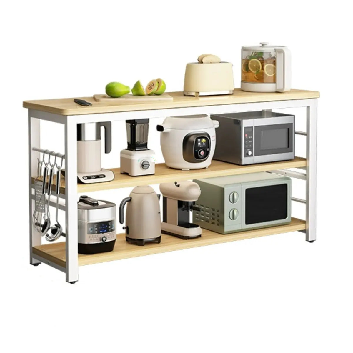 Two open shelves give ample storage options for conveniently storing appliances, such as microwave ovens and toasters.