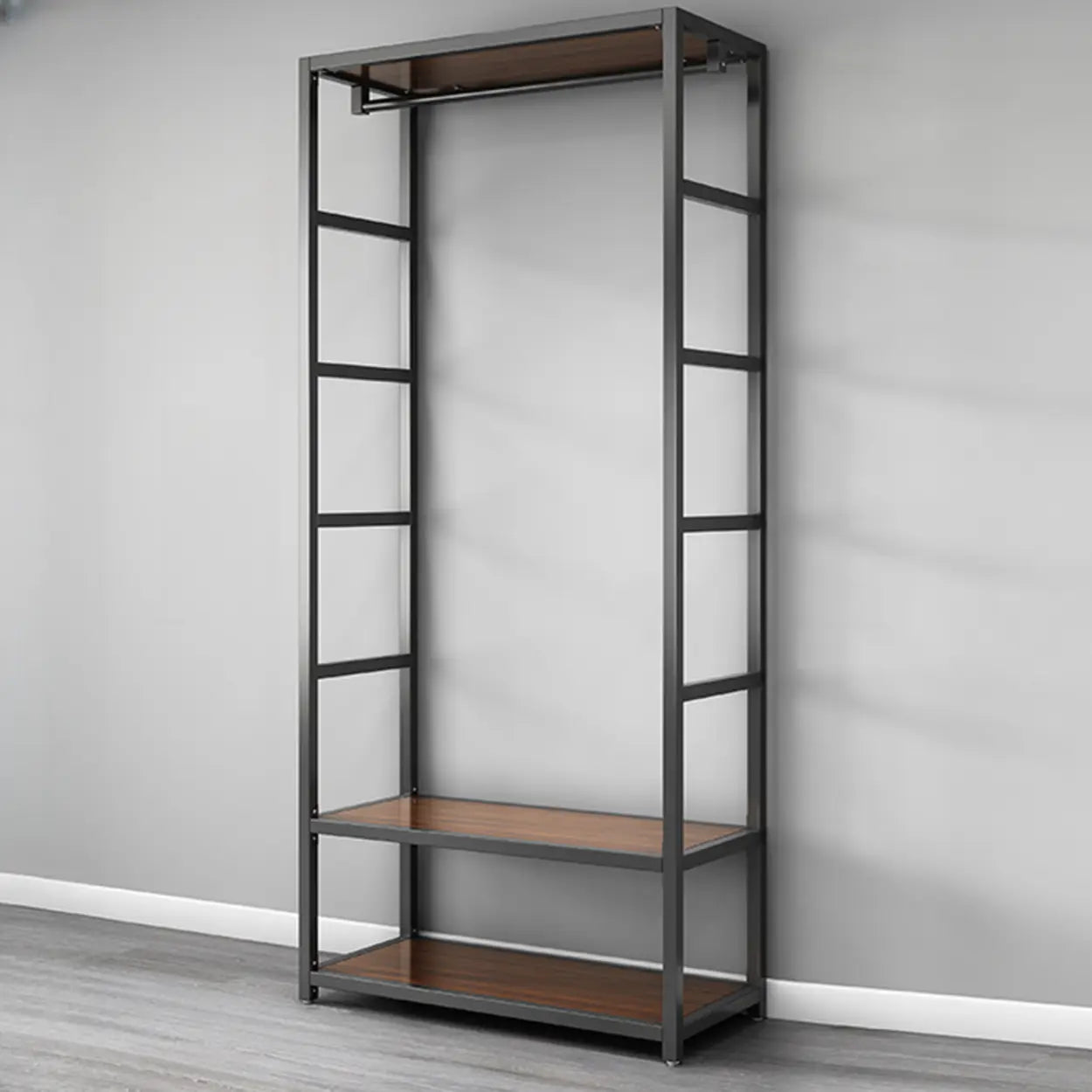 Open Wardrobe Black Metal Frame Coat Rack with Shelves